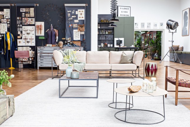 La shoproom se encuentra completamente abierta y comunicada en todos sus espacios a modo de loft industrial, incluída la zona de bañera. Las zonas representan un espacio de vida donde las piezas son las protagonistas, descubiertas en viajes y compradas en mercados extranjeros, creando la atmósfera perfecta donde todo se distribuye de forma funcional y versátil, creando una zonificación de rincones unidos física y visualmente.