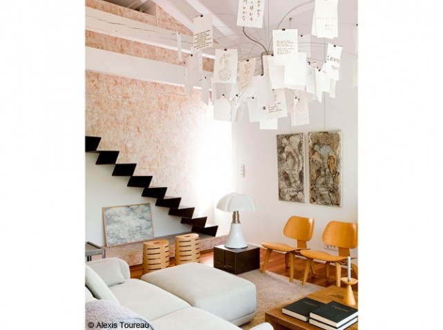 Las sillas "RAR" diseño de Charles y Ray Eames, el sillón "Butterfly", las mesas bajas realizadas con pallets, las lámparas Jieldé articuladas y la de suspensión "Zettel'z" de Ingo Maurer, forman parte de un interior donde predomina el diseño retro vintage.