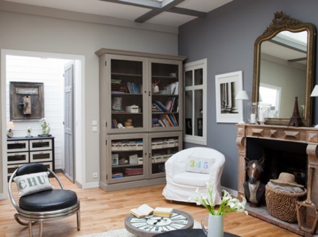 El comedor se sitúa junto a la entrada. Está iluminado por una claraboya, rodeado por un enmarcado en gris. Mesa de café negra con reloj de mesa, una silla de cabecera en metal y cuero, alfombras, lámparas y sillas blancas, espejo y chimenea, componen un conjunto mezcla de estilos muy Vintage.