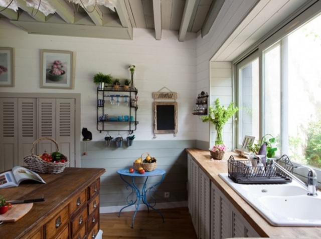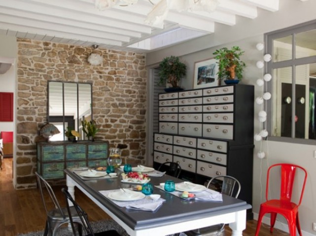 El objetivo de revivir el espíritu de la casa, resaltando los rasgos originales y dando prioridad a las los materiales de reciclaje se puede reconocer en cada rincón de esta vivienda. La pared de apoyo en el comedor, se deja expuesto. Antiguos tablones de madera como revestimiento en las paredes de la cocina y el pasillo, persianas viejas en colores, marcos de ventanas y muebles rehabilitados con pátina ... Son muchos los elementos, hábilmente puestos en escena, que hoy en día proporcionan a la casa el carácter y autenticidad necesarios. el muro de contención de piedra se ha conservado, dando alma a la habitación donde la familia come, con cierto aire vintage-industrial.