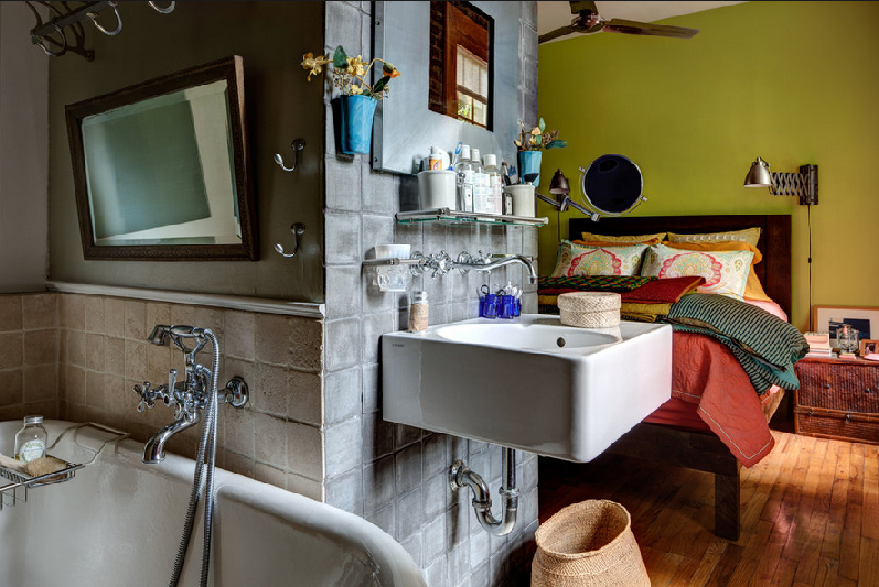 Esta estética aporta calidez al mejor estilo industrial a todo color, añadiendo mayor intensidad en sus colores mediante de los nuevos textiles, la pintura de la pared y los adornos lograran también resaltar un nuevo ambiente. Su creadora e interiorista, Allison Aldrich, también propietaria de la vivienda neoyorquina del West Village, logra mantener el mejor estilo industrial a todo color, principalmente gracias a elementos arquitectónicos y la mejor elección de objetos industriales para la decoración. El comedor, con una mesa vintage de madera recuperada, es una de las piezas más singulares con un juego de sillas desparejadas y una lámpara de fábrica espectacular.