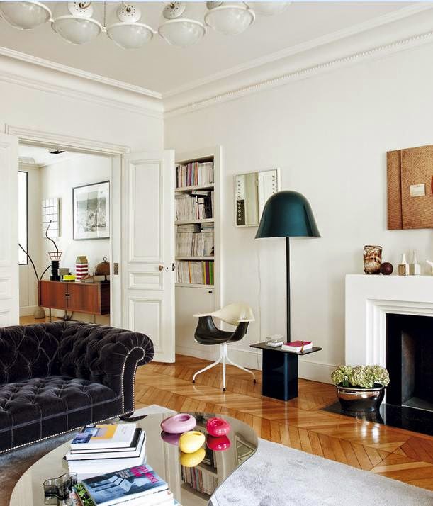 No sé si quedarme con los Chesterfields azules de terciopelo, o con las lámparas de los años 60"s, o con el solado hidraúlico de la cocina, o... ¿no os parece un apartamento de 10?