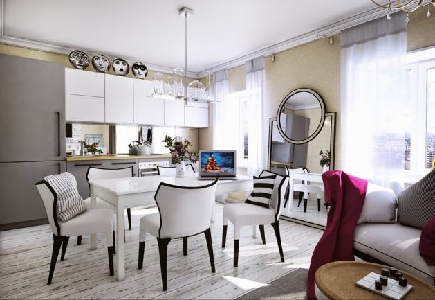 La ciudad es famosa por su clima sombrío y docenas de tonos de gris, por lo que la dueña de la casa quería ver tonos cálidos y soleados en su interior, eligiendo para el proyecto dorados, el blanco y el rosa, combinado con toques de gris azulado. La zona de comedor es sencilla y chic decorada con una de las colecciones de Philip Stark y no rivaliza en estilo con la lámpara de araña que preside como protagonista la sala de estar.