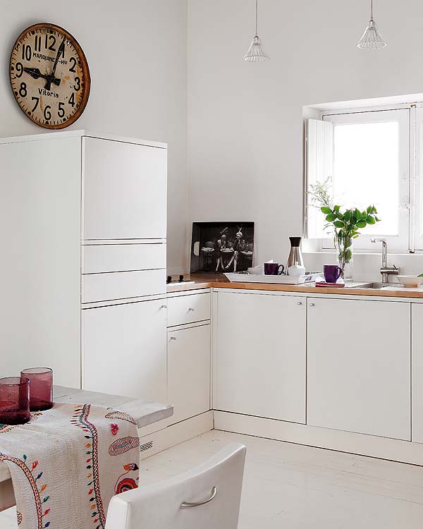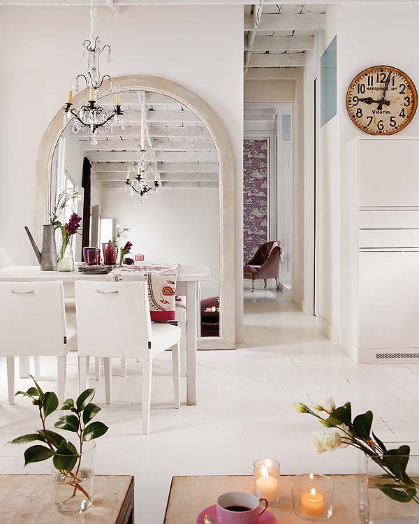 Un techo con las vigas de madera recuperadas y que no se ocultaron con uno falso, sino que se pintaron y se tornaron luminosas por el color blanco, ganando el altura y carácter original y vintage, dada su textura natural. El blanco, como recurso característico principal, tiñe así las paredes y también el suelo, incluso algunos muebles. Con esta puesta en escena "total white" son los complementos, los textiles y los tapizados del salón los que aportan la nota de intensidad y dinamizan los ambientes. El maxi espejo del comedor con forma de arco dota al ambiente de un aire más exclusivo.