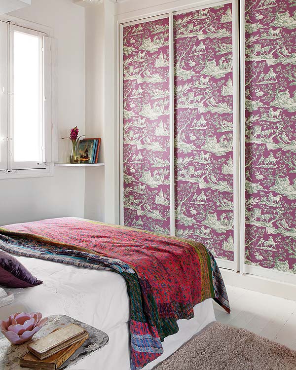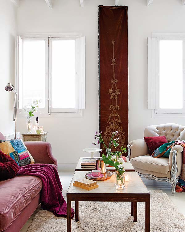 Toques vintage que dotan a este interior de la elegancia que aportan los tejidos aterciopelados, antiguos, que pertenecían a la familia, y que ahora imprimen calidez al salón en forma de bonitos tapices. Los muebles también aportan su toque retro-vintage pues prodecen de un mercadillo de antigüedades de Aviñón.