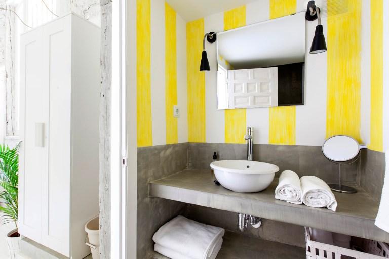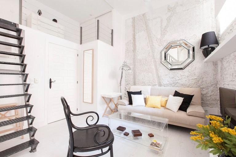 La zona social, en concepto abierto, se integra y compone de una cocina completa con mesa de comedor y un salón recogido, práctico y muy coqueto. El baño, espacioso y con personalidad, combina el amarillo y las tonalidades grises, lo que confiere al espacio un toque industrial que realza su potencial. En el salón y en la cocina se opta por la gama de colores grisáceos, los electrodomésticos en acero y el mobiliario con predominio del blanco y la madera. Los acentos de color los ponen los cojines, las plantas o el menaje de cocina.