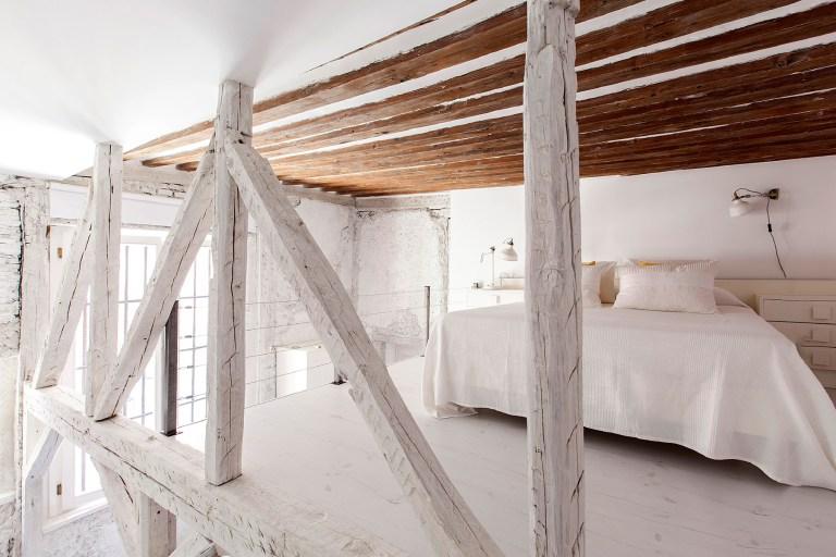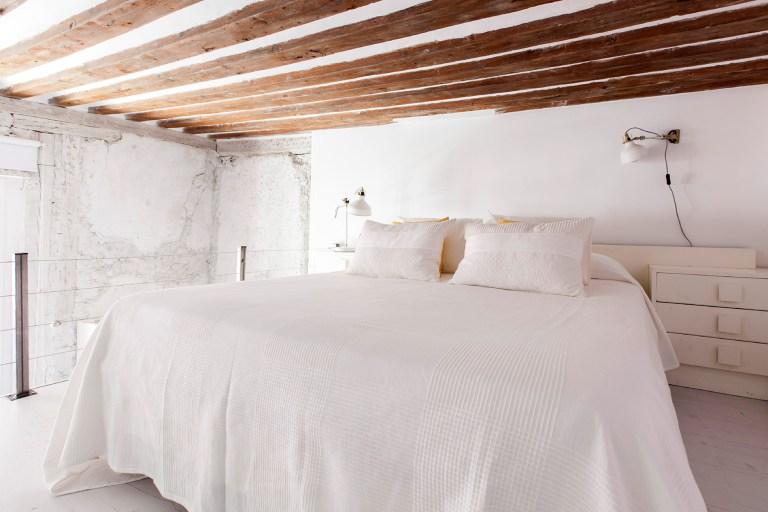 En el altillo se ubica la zona de dormitorio y un armario doble. Gracias a los grandes ventanales y al estar el espacio abierto en doble altura, la luz rebota en todos los paramentos verticales, reflejando y dando luminosidad y calidez a todo el interior.