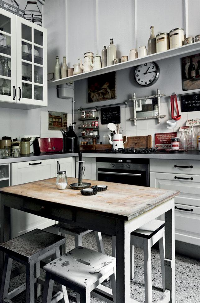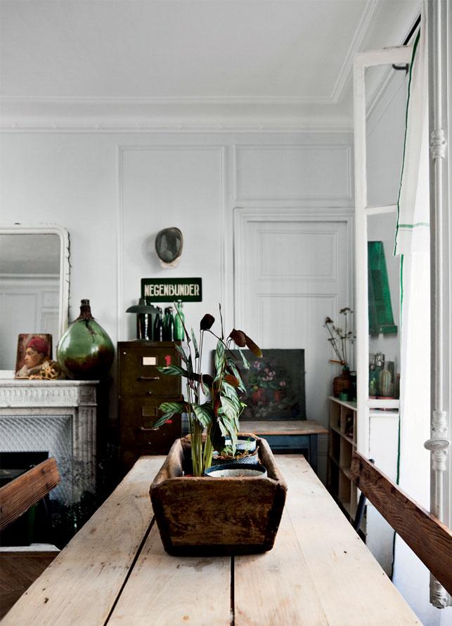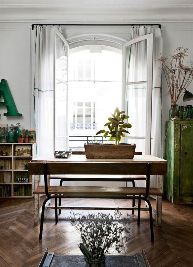 La cocina es pequeña, pero cuenta con todos los cacharros a la vista y un espacio central para sentarse y disfrutar de un desayuno rápido, perfecta para cocinar y para ser vivida. Un comedor sin excesivas pretensiones, con una mesa sencilla y dos bancos, también con los toques de verde que recorren toda la vivienda, que nos muestra una forma de vivir, sosegada y relajada que para la mía quisiera. Y se contagia también el gusto por recuperar y dar nueva vida a objetos y mobiliario: recycling design. En el dormitorio, las dos hojas de ventana mallorquina hacen las veces de fondo para dos mesitas, que no son más que dos sillas. Dos flexos gemelos juegan a la simetría mientras que la colcha de lino vuelve a conectar con el espíritu natural y auténtico de toda la casa. Vintage total ¿no os parece?
