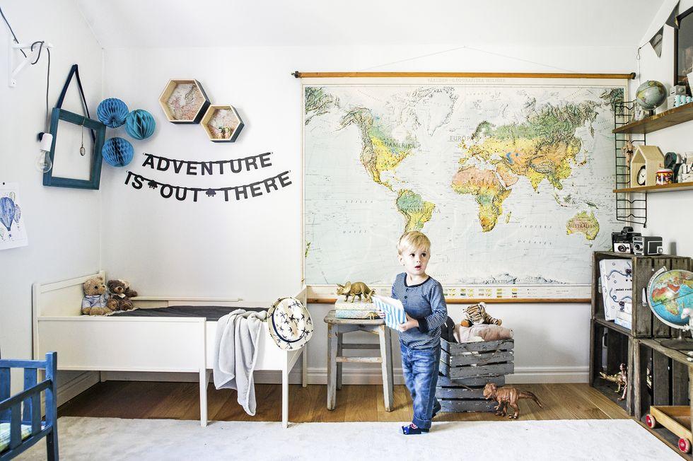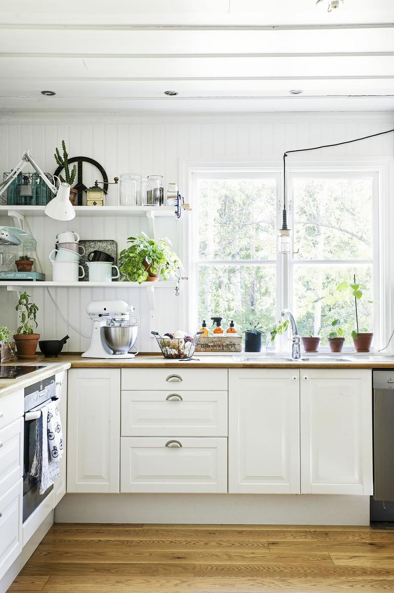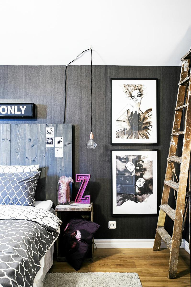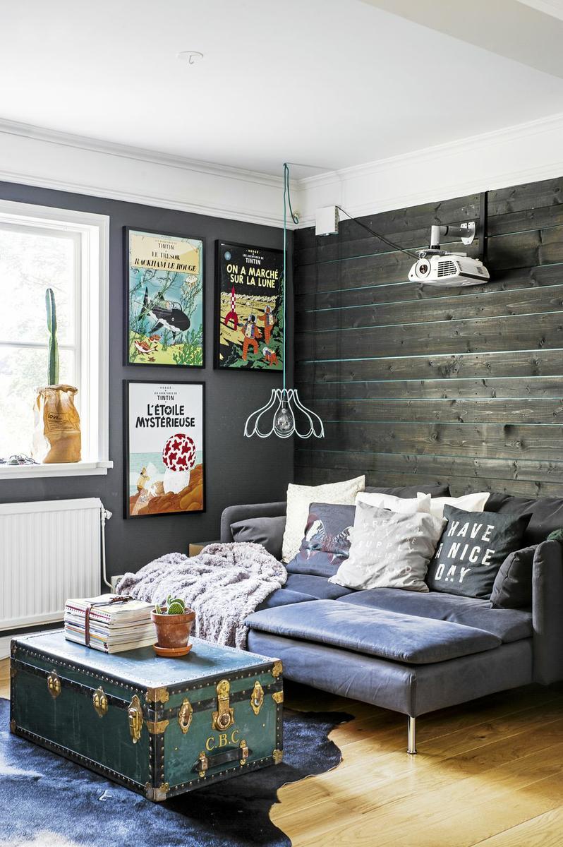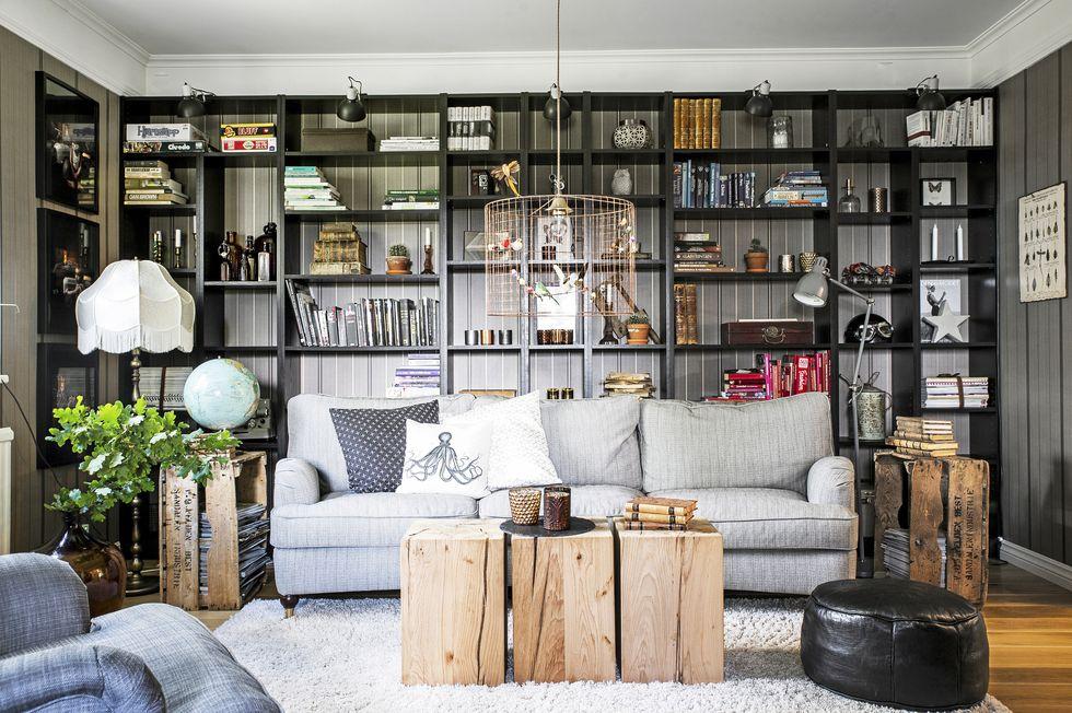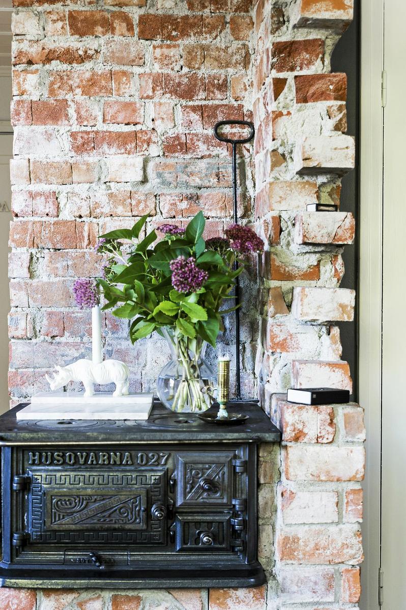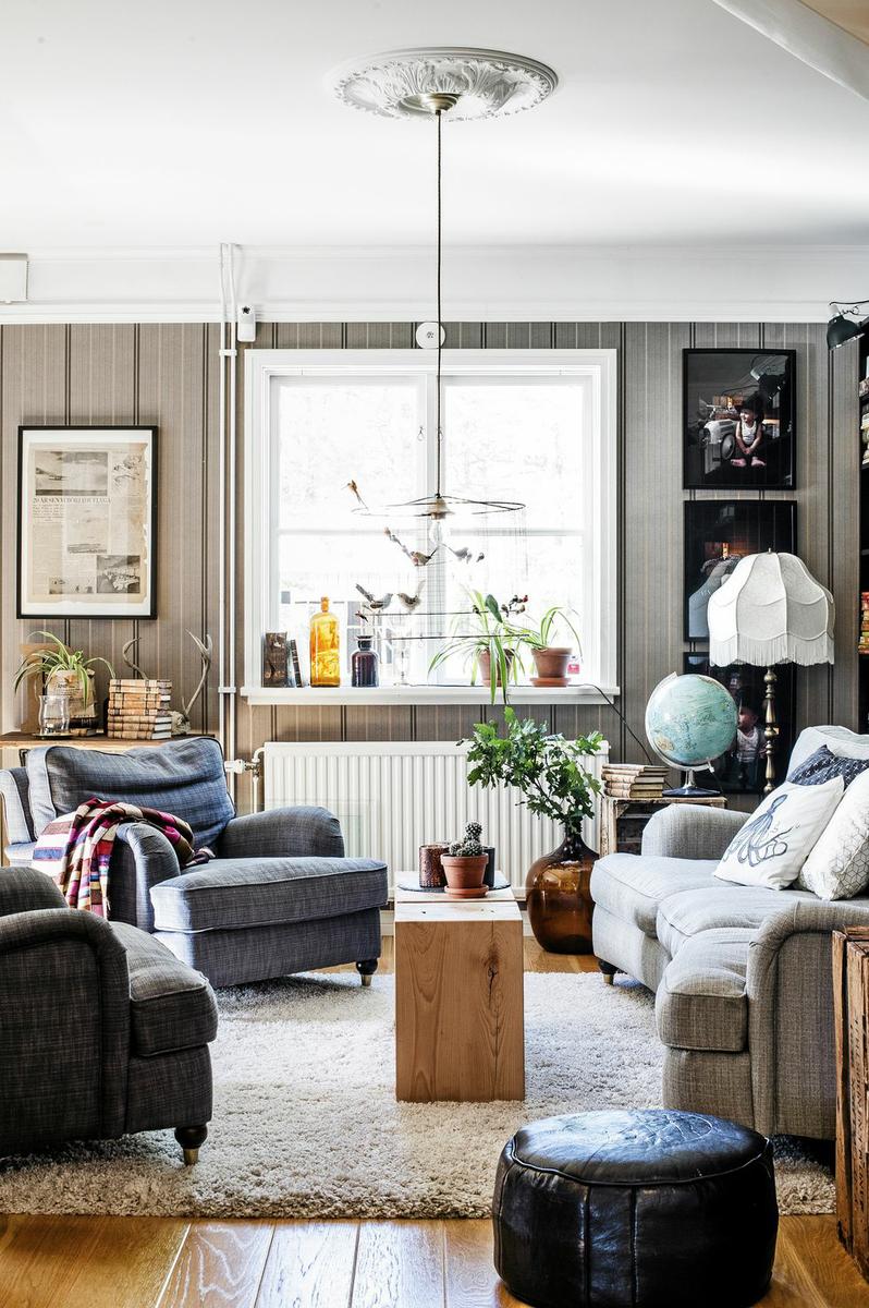Una vivienda llena de energía positiva y detalles encantadores. Después de vivir años en Estocolmo, la capital de Suecia, en los clásicos apartamentos blancos escandinavos, los propietarios de esta casa decidieron escapar de la vida de la ciudad y encontrar la felicidad en un hogar que es, completamente opuesto a la zona donde vivían hasta entonces. Elementos decorativos como paredes grises y negras, suelos de madera, ladrillo visto en paredes y varios detalles retro, están conectados a una unidad cálida, exquisitamente diseñada. La cómoda sala de estar está llena de grandes piezas de mobiliario, y la atención se ve atraída por el papel pintado a rayas gris-negro muy original. La larga pared de la residencia está cubierta con estantes abiertos que están llenos de libros y pequeñas cosas y actúan como adornos decorativos del propio espacio. La cocina, con sus paredes blancas, y los elementos de ésta, como estantes a la vista, contrastan con el resto de la sala, y su brillo acentúa aún más la luz del sol, que penetra a través de la gran ventana.