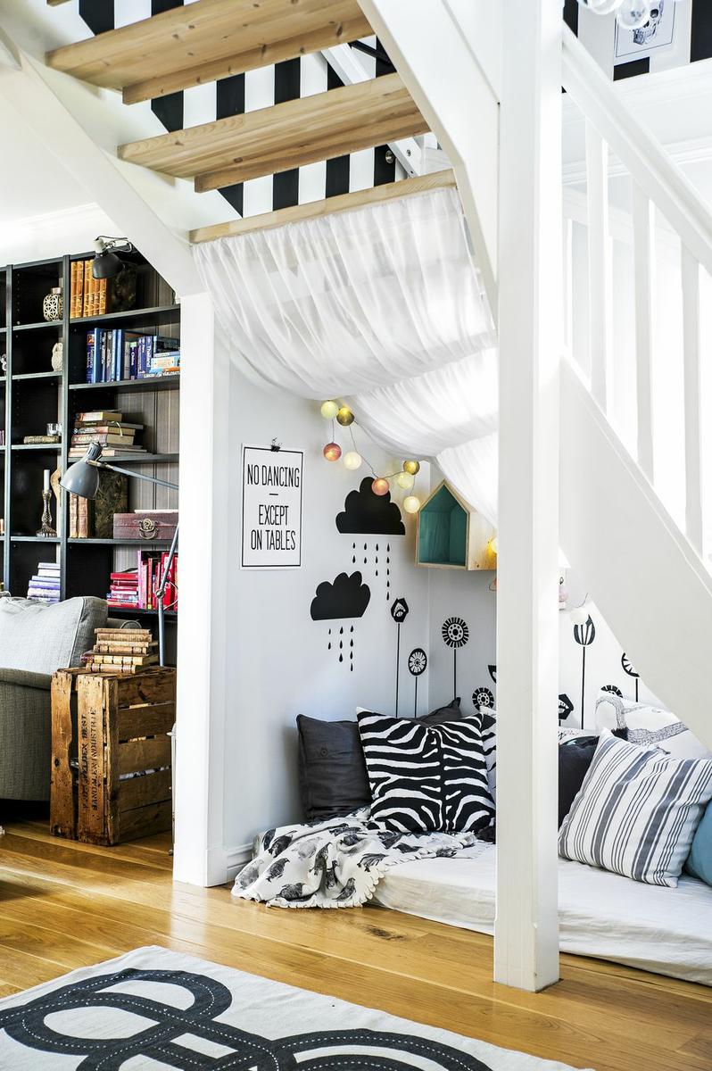 Una de las zonas más atractivas de la casa se encuentra debajo de las escaleras, que conducen a la planta donde el espacio disponible se utiliza para crear un cómodo rincón de descanso en el que los niños pueden almacenar y leer libros, jugando durante horas. Los dormitorios se encuentran decorados en el mismo estilo que las habitaciones de la planta baja, caracterizados por el uso de colores llamativos y mezclando diferentes estilos de decoración de una manera fresca y creativa. Una vivienda llena de carácter de la que os dejo disfrutéis.