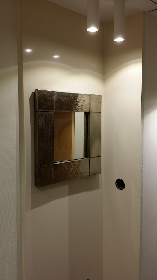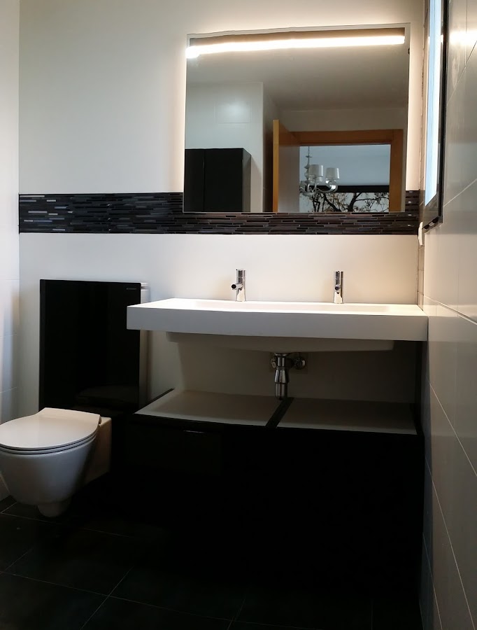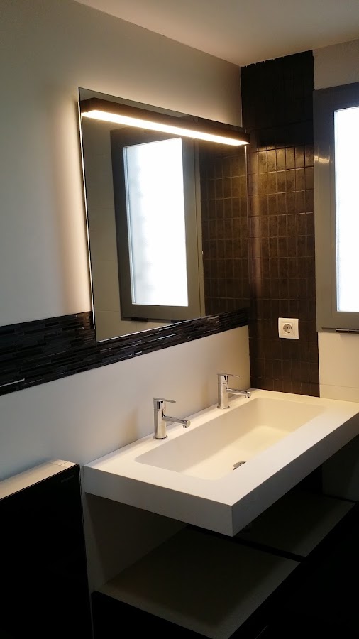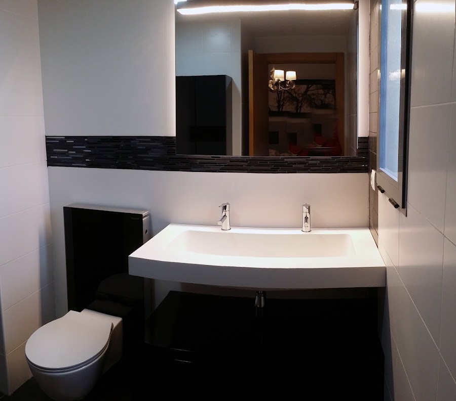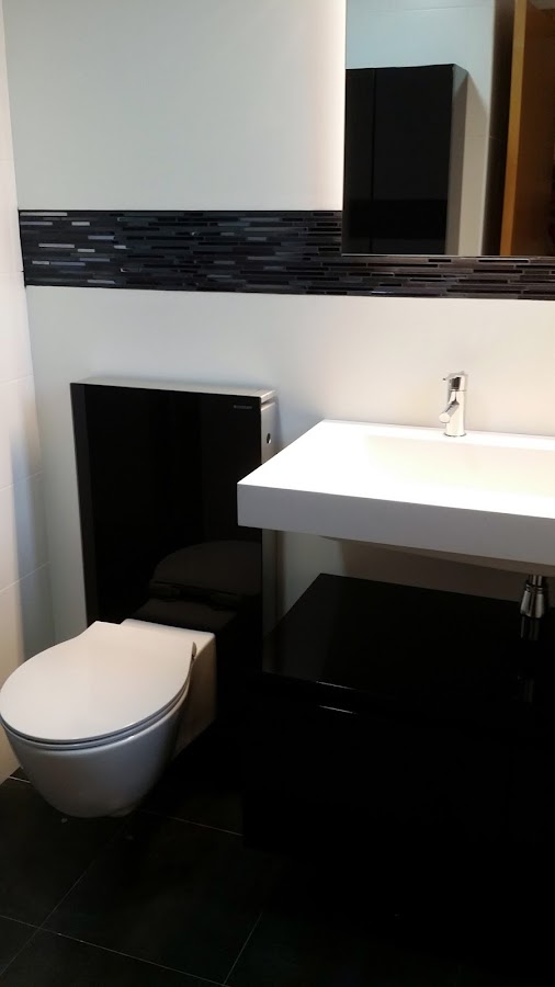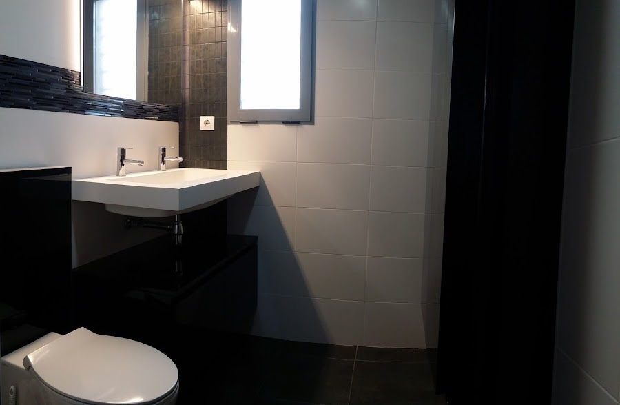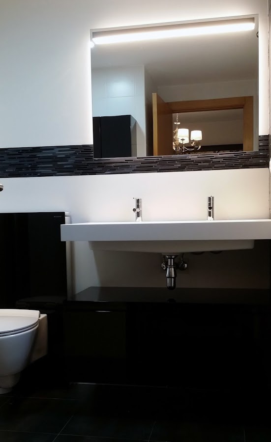 En el baño principal había que mejorar la funcionalidad (almacenaje, mejora de la instalación de fontanería, enmasillado y alisado de techo, instalar mampara) y la estética (sustitución de sanitarios, espejo retroiluminado con leds y aplique incorporado, forrado del azulejo del frente con piezas de gran formato, lavabo doble e instalación de mobiliario en lacado negro alto brillo)