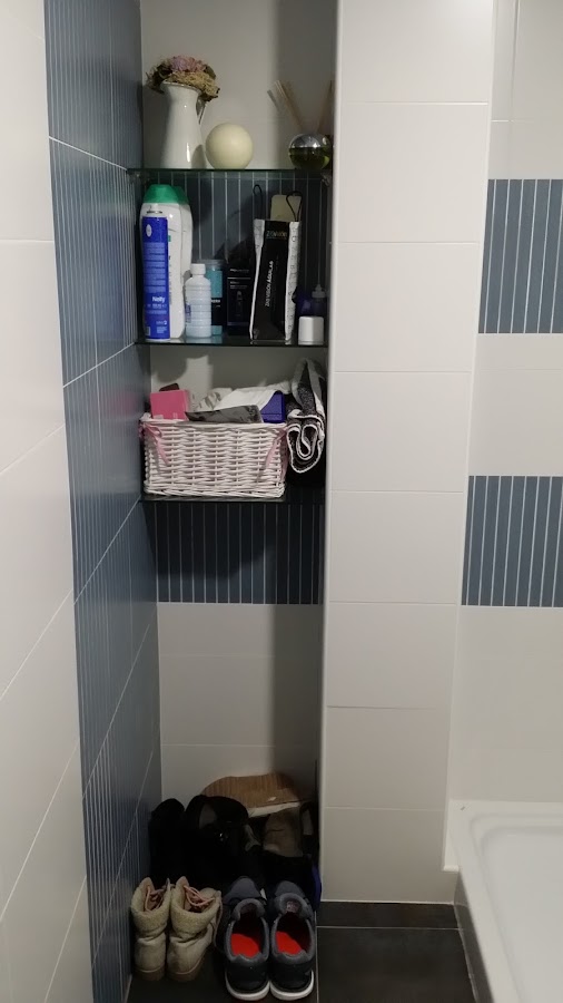 La ducha no se utilizaba y sin embargo era prioritario crear una zona de almacenaje que no resultara excesivamente pesada en el espacio de uso.