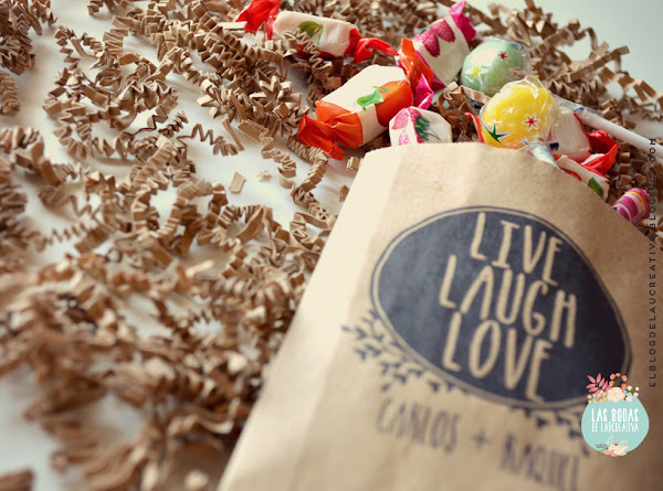 Querían regalarle a los invitados unas chuches, así que les personalizamos unas bolsitas, también en kraft. Llevan el mismo sello de la postal y el nombre de los novios.