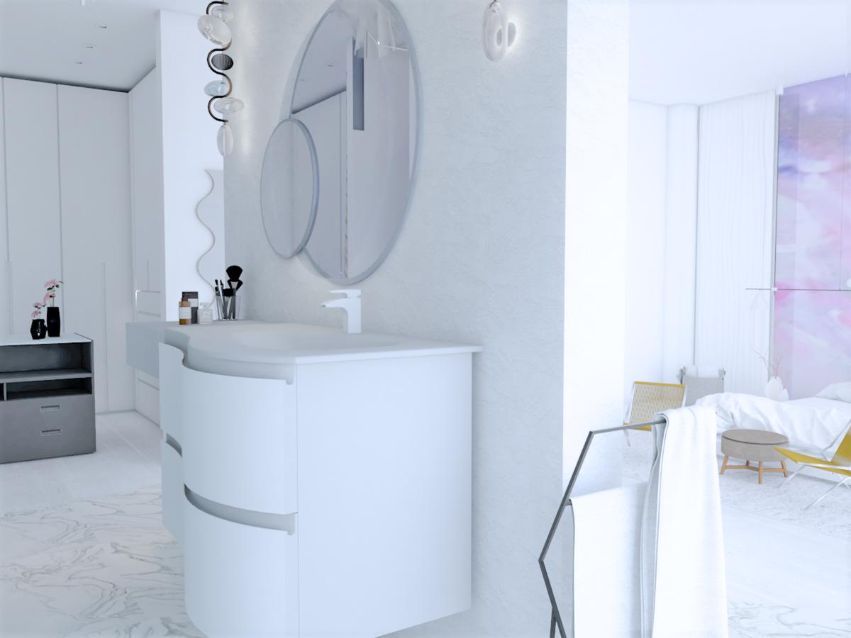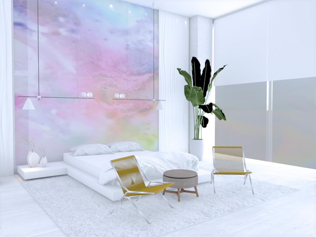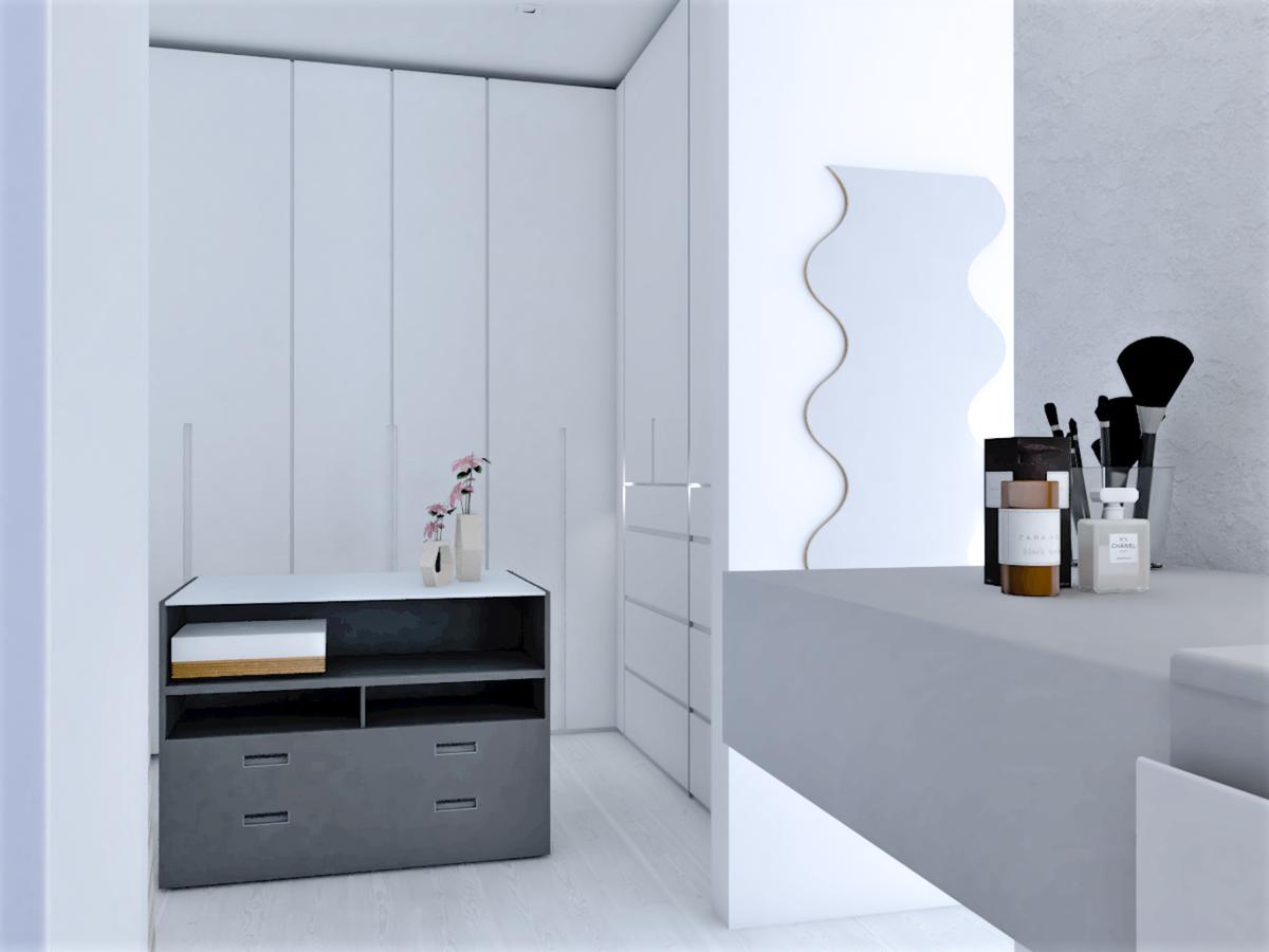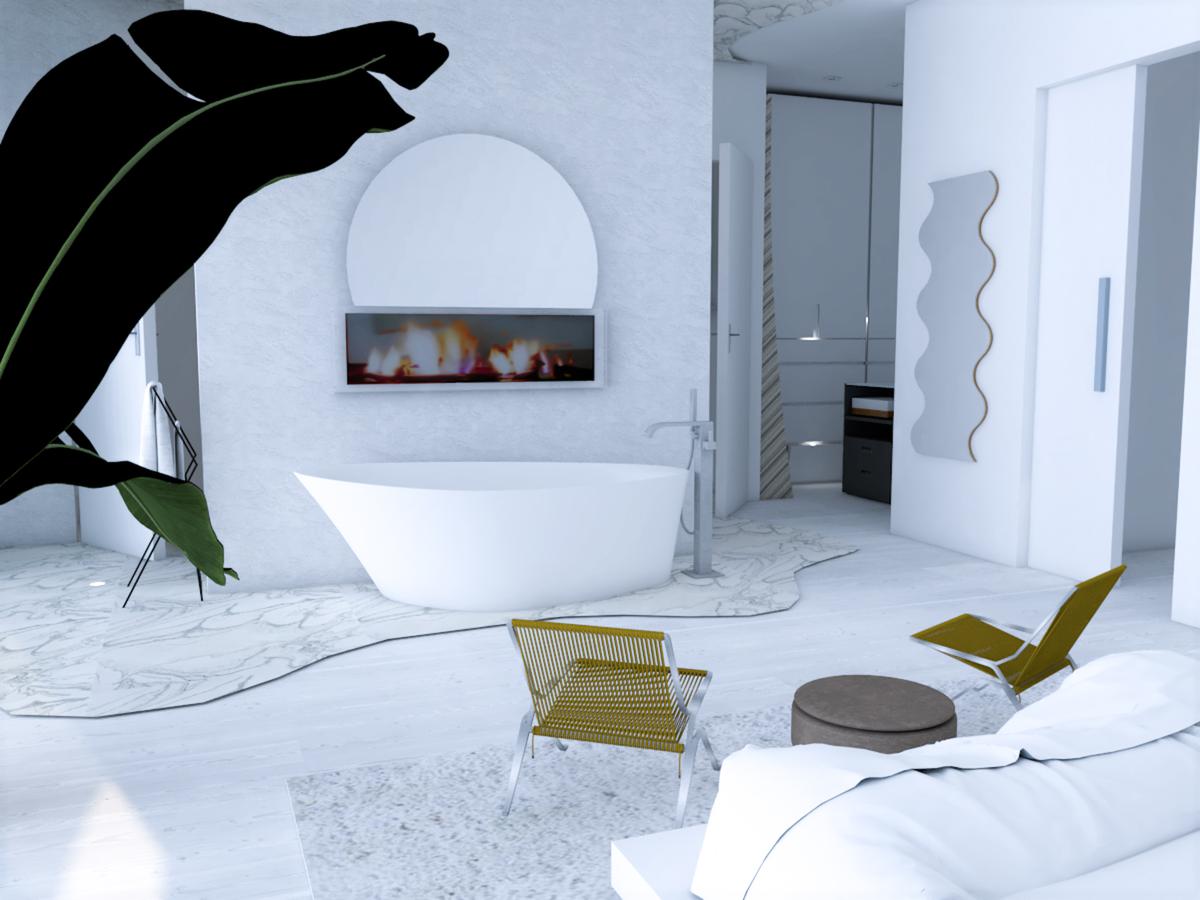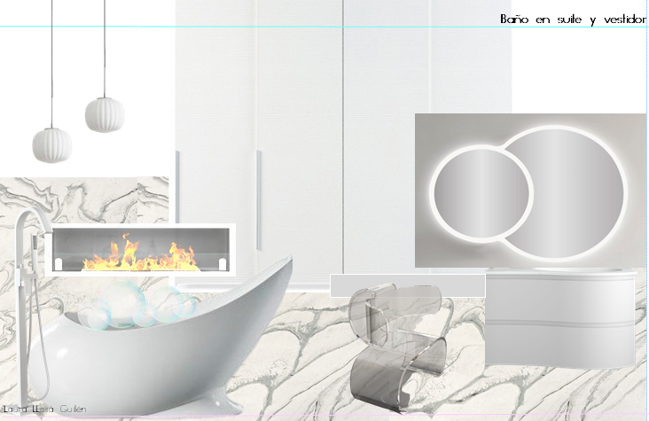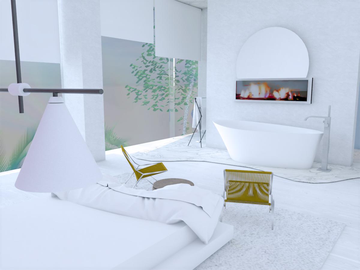 En el último post de la saga de mi Trabajo Final de Máster, he diseñado el dormitorio de mis sueños: con un vestidor enorme con isla para complementos y una bañera exenta con vistas, en la propia habitación.