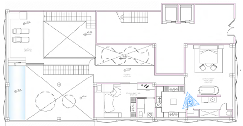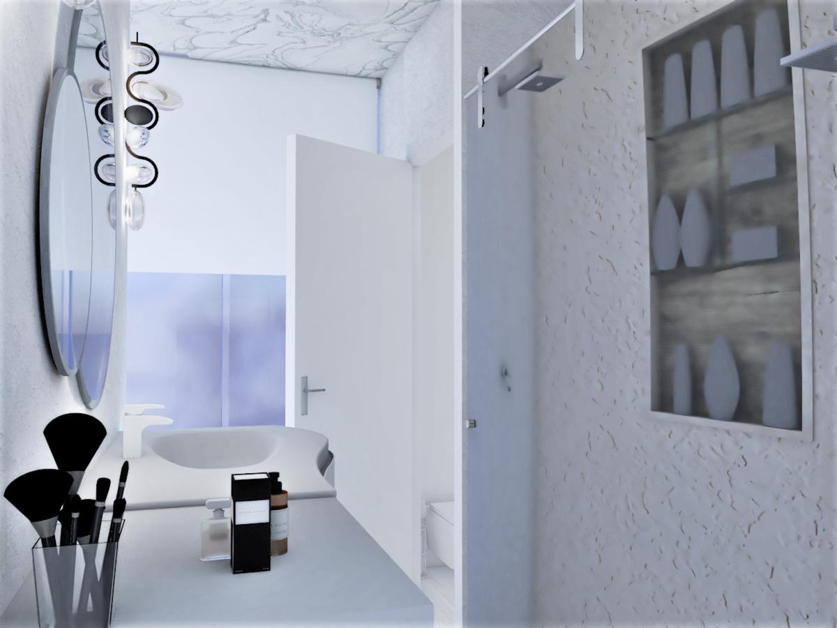 En pavimento de la zona del baño con forma irregular, es el liquid sky Dekton de Cosentino y se ha reproducido en el techo.