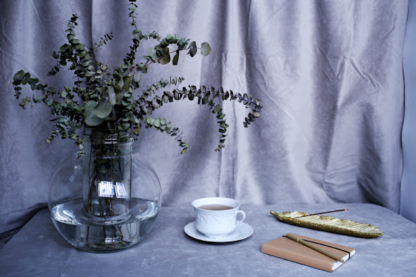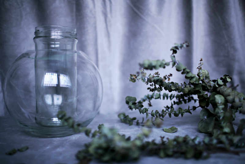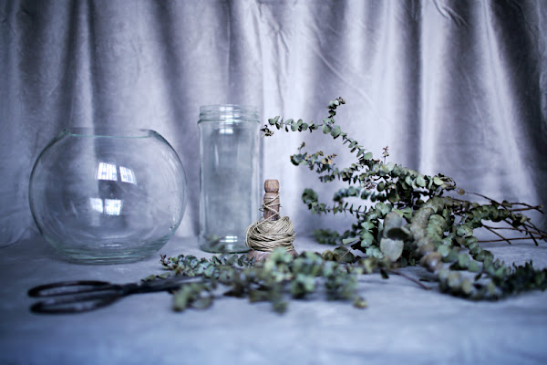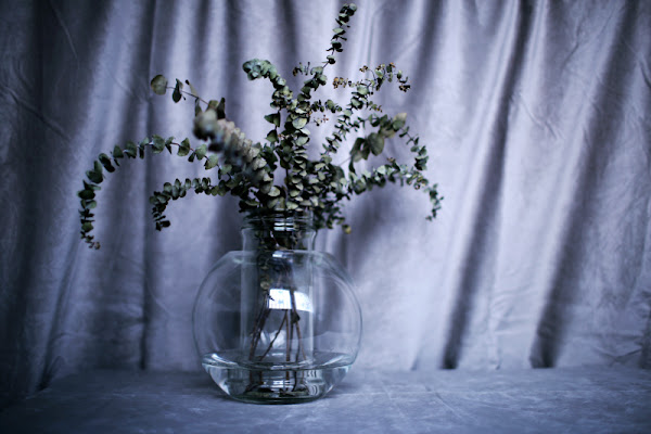 El jarrón alto es en realidad un bote de cristal de unas verduras en conserva que reciclé como florero y utilizo bastante para arreglos florales que requieren un contenedor de boca estrecha. Cuando no tengo flor fresca cortada suele estar ocupado por unas ramas secas de Eucalyptus Gunnii o alguna flor artificial en tela de las que tengo en casa.