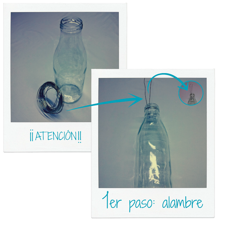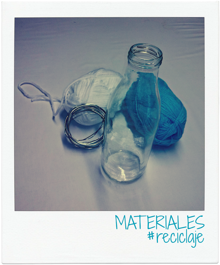 Los materiales son todos reciclados. Necesitaremos una botella de cristal de las que recuerdan a las viejas botellas de leche (hoy día muchos zumos, por ejemplo, las traen de este estilo); alambre para crear el colgador; y restos de lanas (o lazos, o cordones) de colores. Según la fuerza que tengáis, podríais necesitar también un alicate para trabajar el alambre.