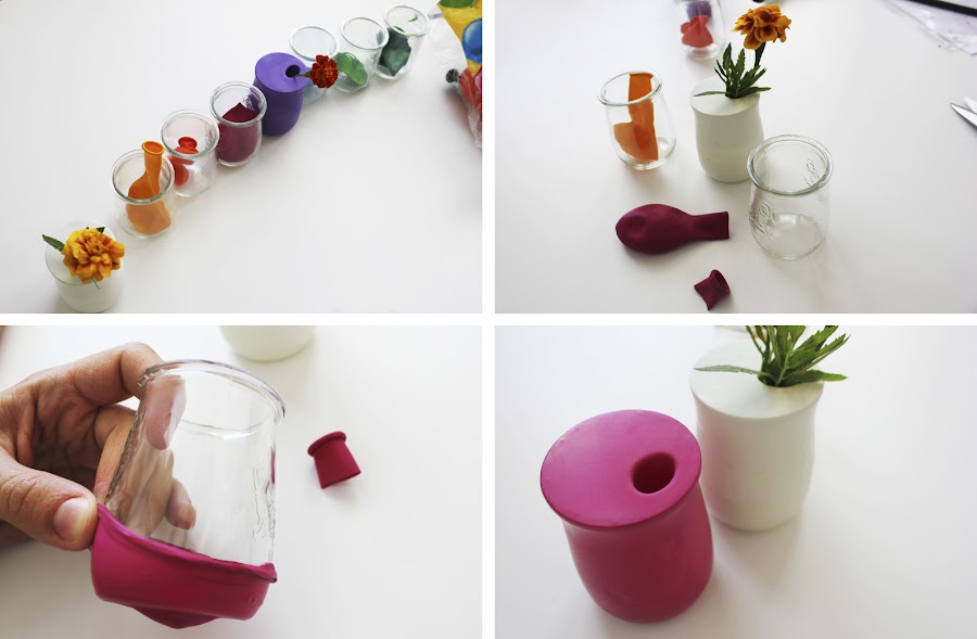 Vasitos de cristal o tarros de yogur reciclados, globos de los colores que quieras y tijeras.