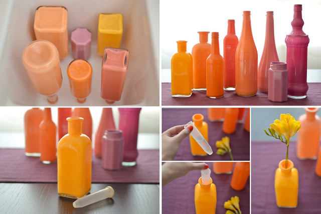 Hoy os traigo estos tan de actualidad coloridos jarrones pintando algunas botellas por dentro, para darle un aire más primaveral a nuestro comedor. Os explico cómo, paso a paso.
