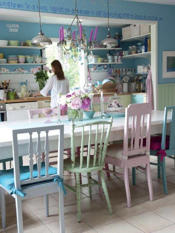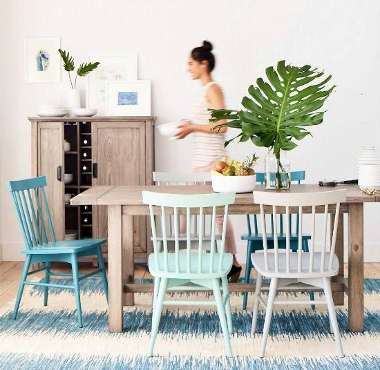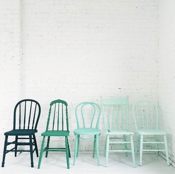 Otra opción para crear un mix de sillas, es jugar únicamente con los colores, utilizando el mismo modelo de silla. Podemos pintarlas de varios colores, dando movimiento y personalidad a la decoración, pero de una forma más ordenada. Podemos pintarlas a pares, destacar solo una de las sillas, utilizar un color o hacer un degradado… Como siempre os digo, con la pintura no hay límites, así que imaginación al poder.