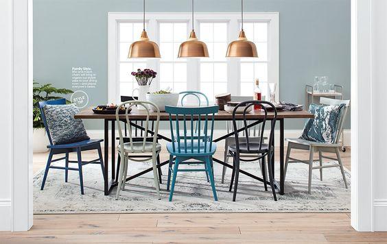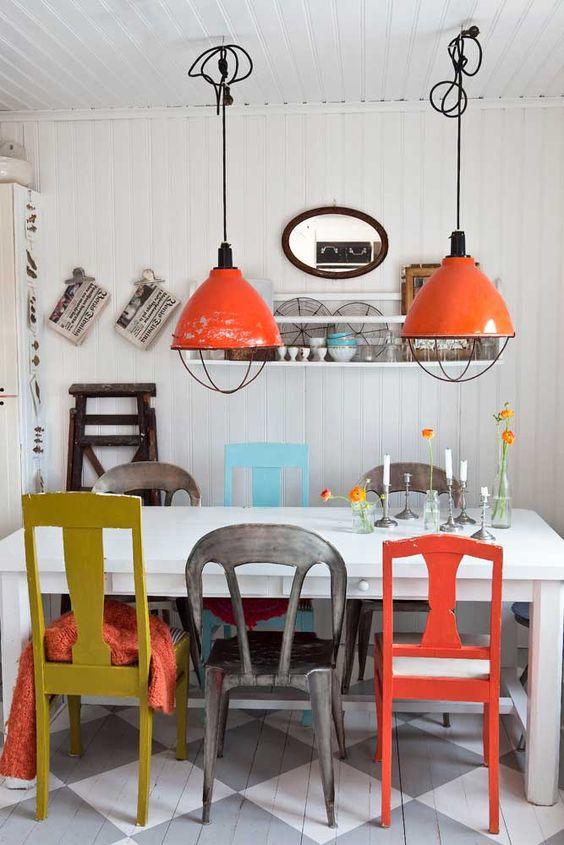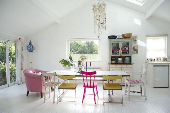 Y aquí la más loca de todas, jugando con los diseños, con los colores, los estampados… Lo ideal para este caso es crear un entorno neutro, de esta manera le daremos a nuestro juego de sillas el protagonismo que se merece. Como en el apartado anterior podemos jugar con los colores como más nos apetezca, con colores diferentes o utilizando tonos similares.