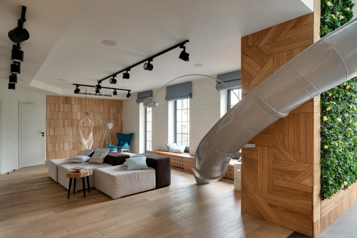 Además de todos estos elementos divertidos, el interiorismo de esta casa es minimalista con lineas sencillas, puras y elegantes pero con toques que aportan calidez y personalidad. Las plantas trepan por las paredes y aporten un toque natural y de color. La madera es el elemento principal de mobiliario y estructura, junto con el hierro en color negro. El azul como color complementario está presente en la butaca y las sillas de comedor completando la paleta cromática.