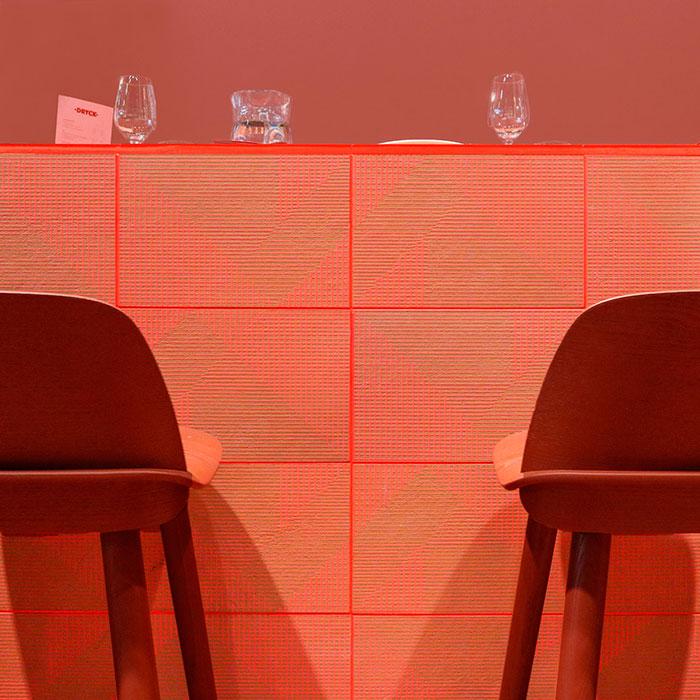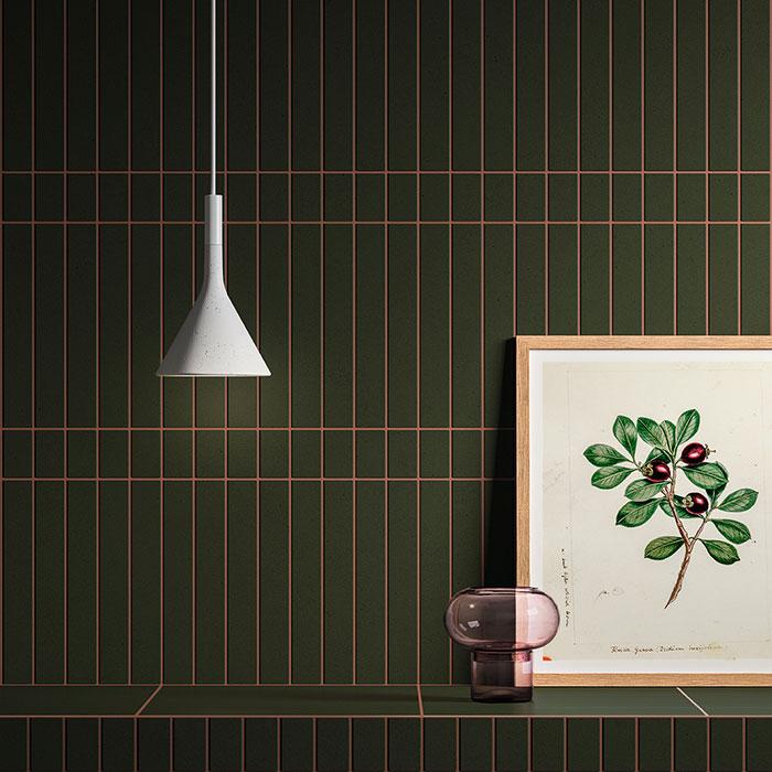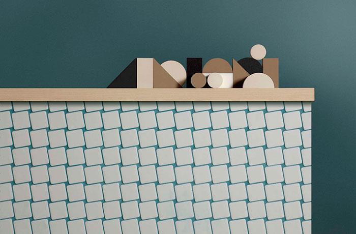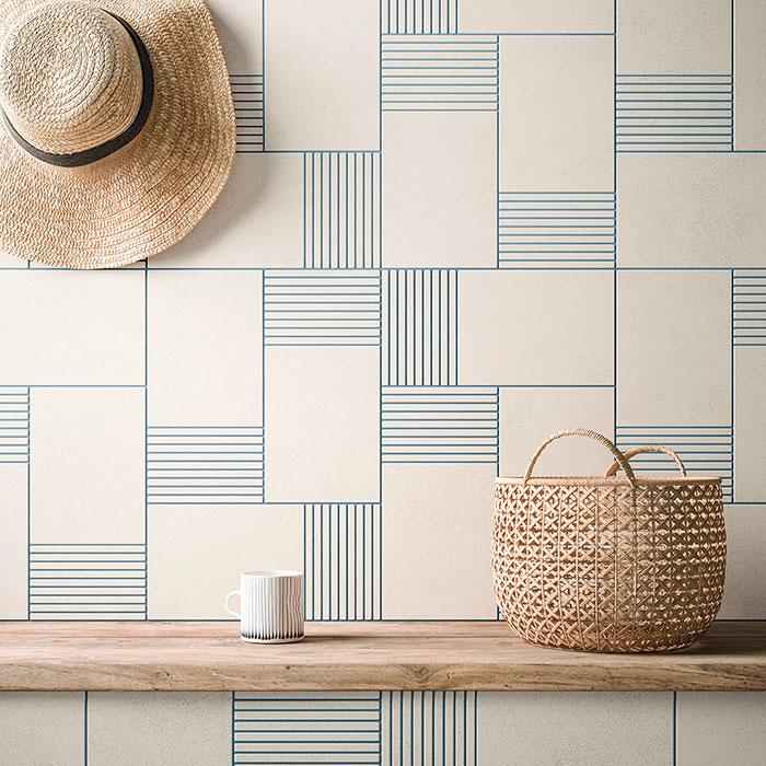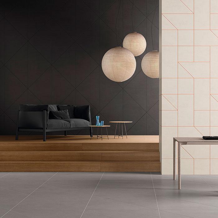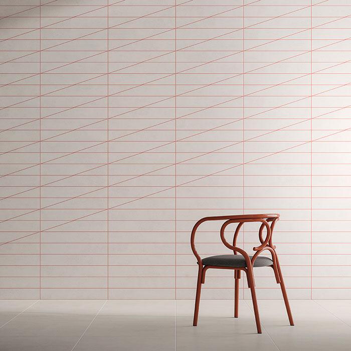 Existen también piezas cerámicas de tamaño medio, a las que se le relizan hendiduras en su superficie que posteriormente se rellenan con el color de junta escogido. Esta es la técnica empleada en la colección Cava de Living Ceramics.