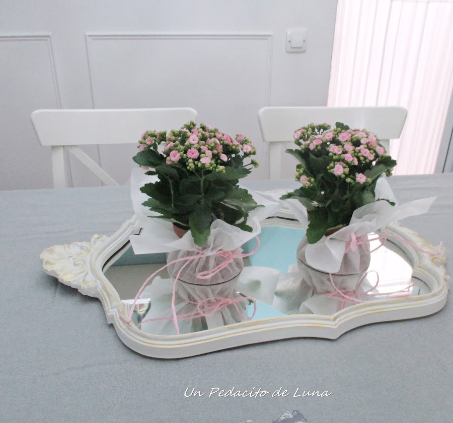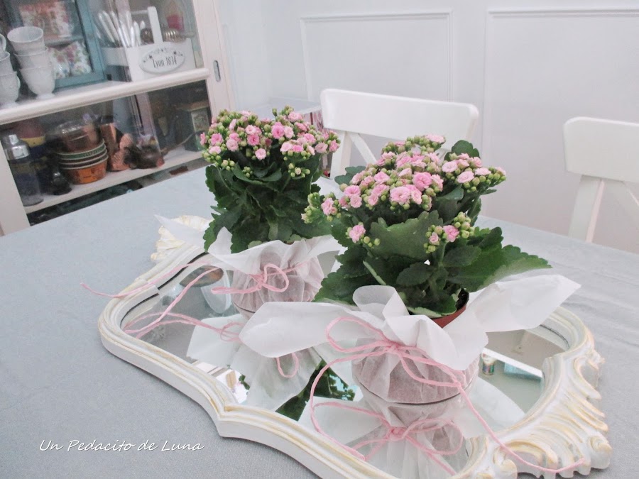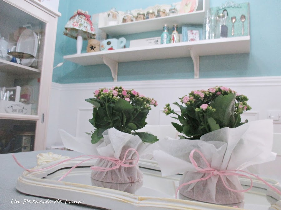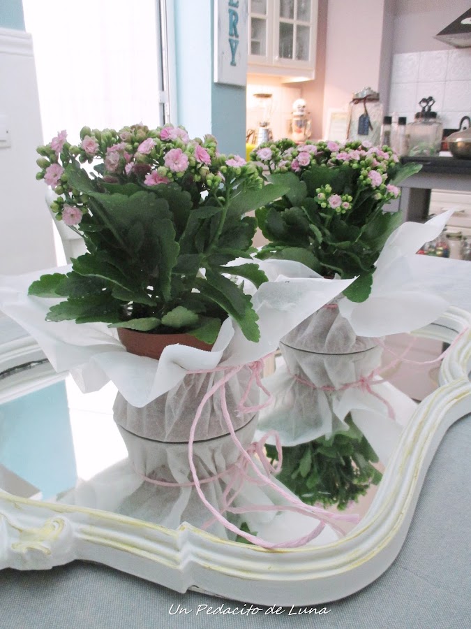 Los kalanchoes rositas los vestí con papel encerado de horno y lazada con cordel en el mismo tono.