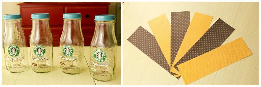 Para adornar las botellas y, de paso, cubrir las etiquetas originales si decides no quitarlas, corta unos rectángulos de papel adecuados al tamaño que necesites (más o menos grandes según si dejaste