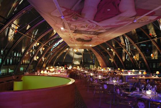 Para los que seáis unos forofos de Sexo en Nueva York (como es mi caso) no os costará reconocer este restaurante. Aparece en el último episodio de la serie, cuando Carrie Bradshaw conoce en París a la ex-mujer de su pareja, el artista Alexander Petrovsky. En esa escena Carrie alucina con la decoración del establecimiento y con su ubicación, en el último piso de un elegante edificio delante del Pont Neuf, y bajo una cúpula acristalada con unas vistas absolutamente impresionantes. Precisamente la ex-mujer de Pretovsky critica la estética del lugar, diciendo que las sillas le parecen horrorosas. Pues sin ir más lejos, se han convertido en la seña de identidad de Kong.