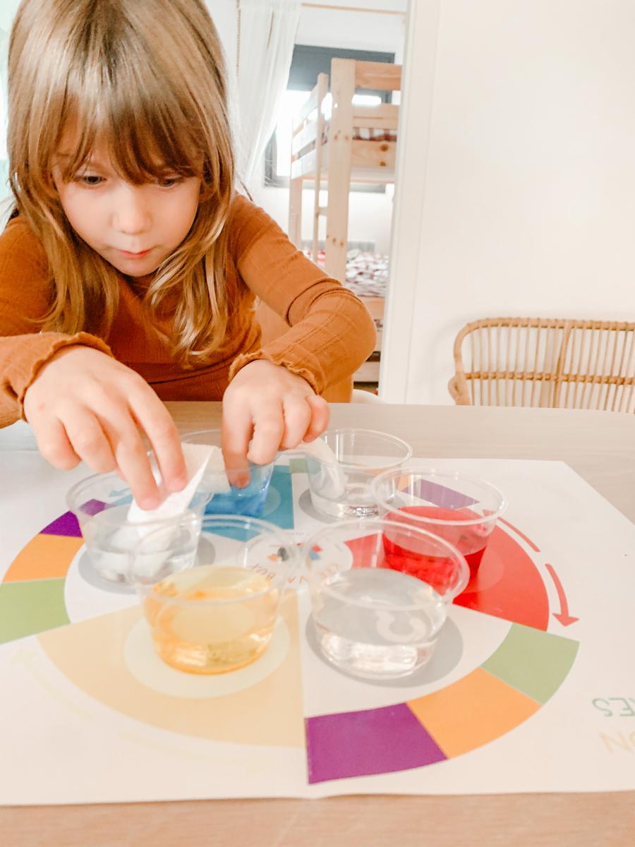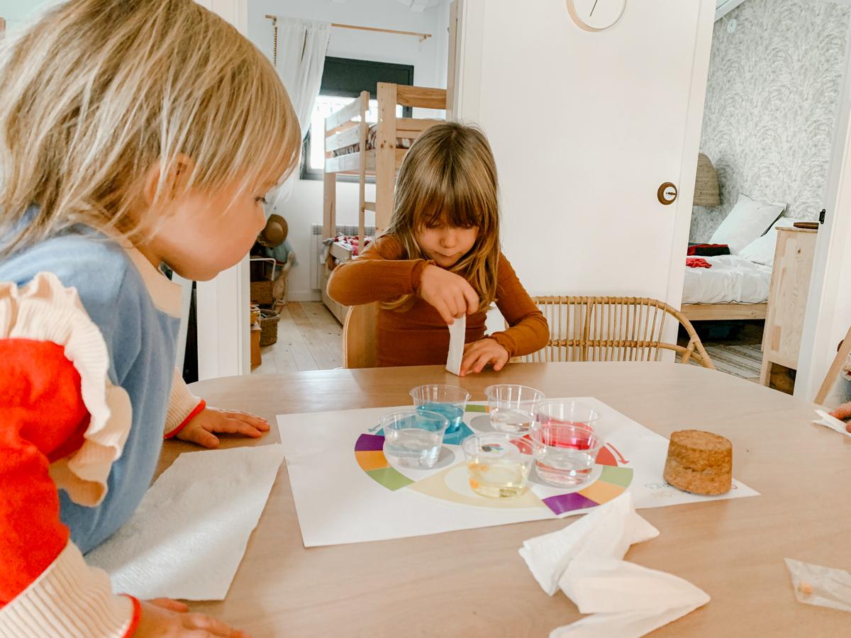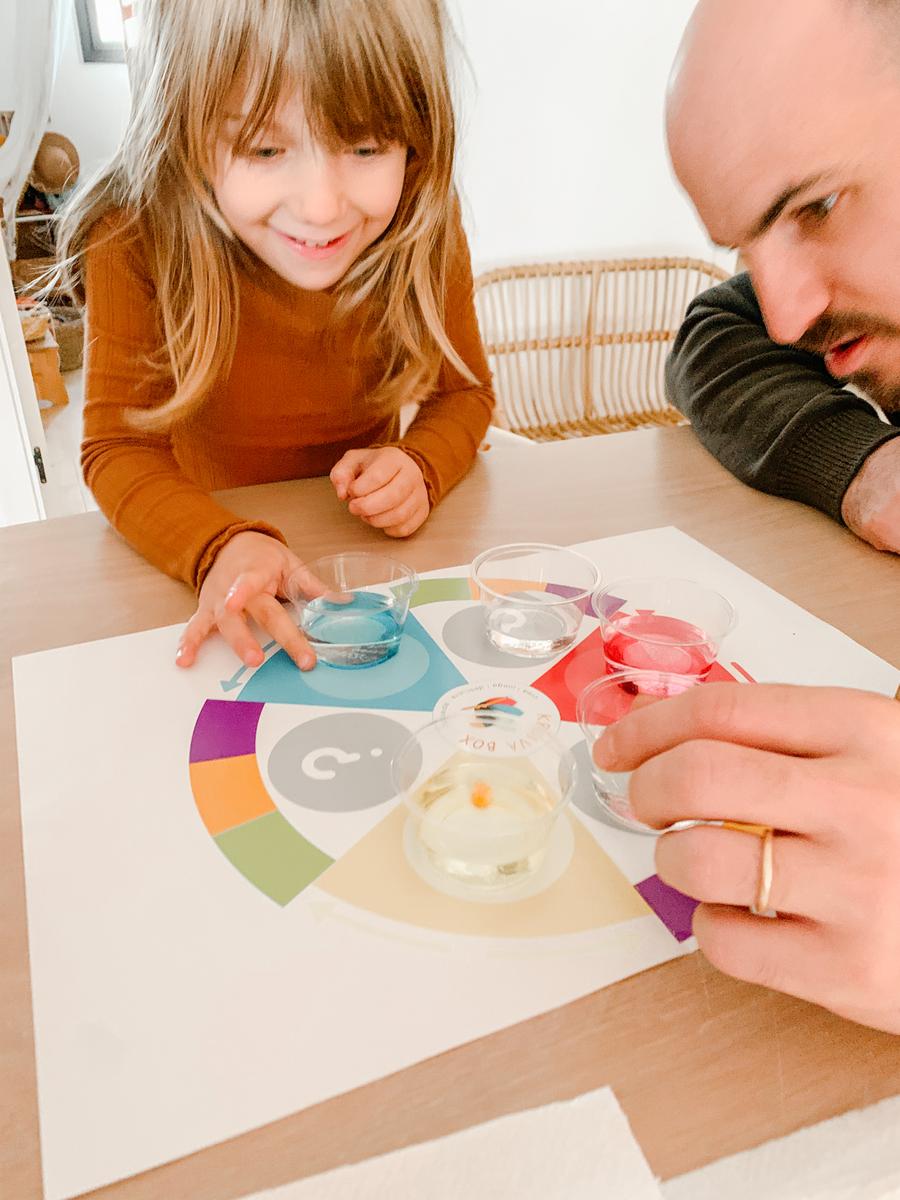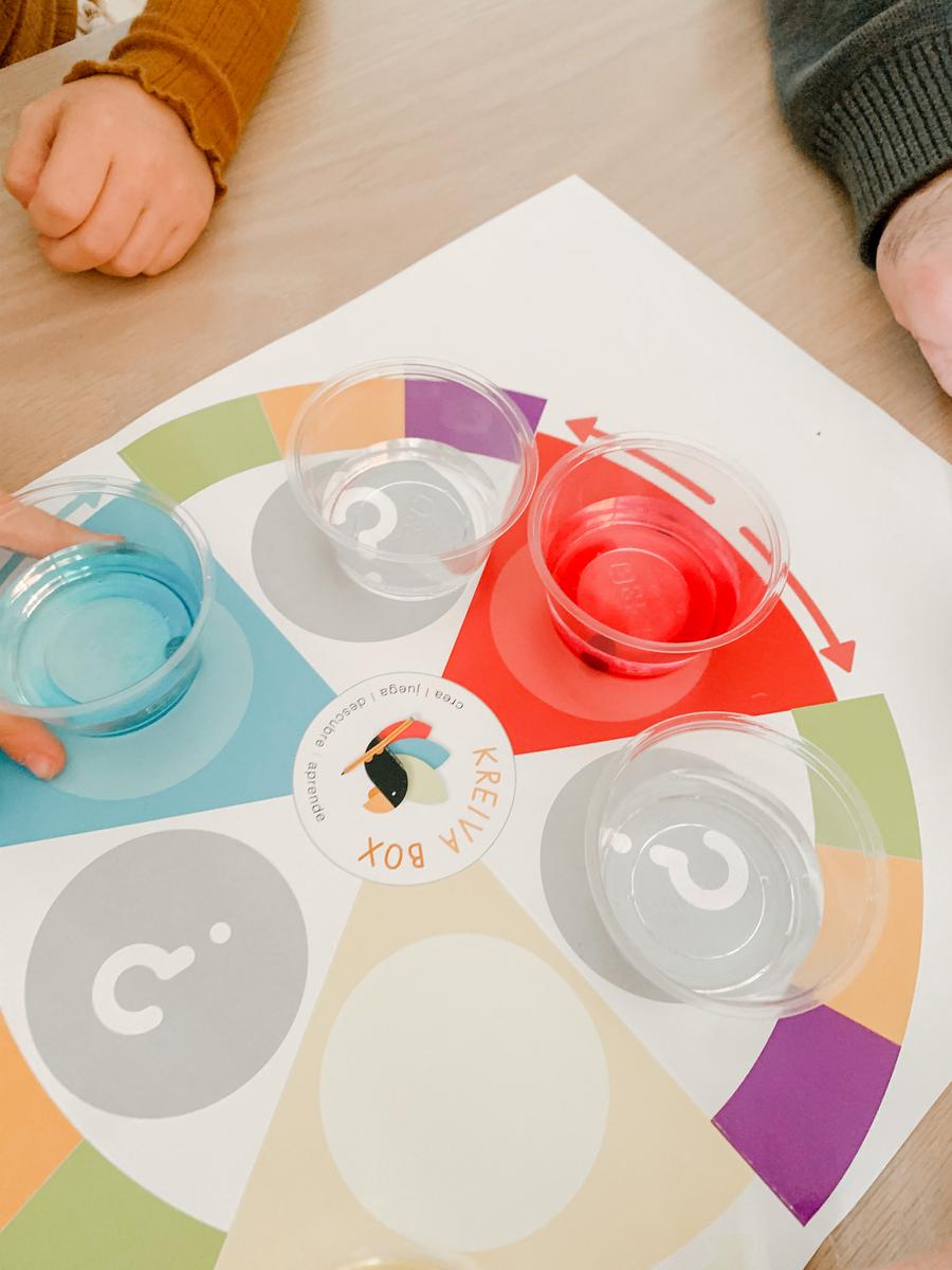 En este kit venía todo lo necesario para hacer un circuito y ver cómo viajan los colores, crear un zapatero con pruebas de colores, ver cómo se transforman y cambian los colores en contacto los unos con los otros…