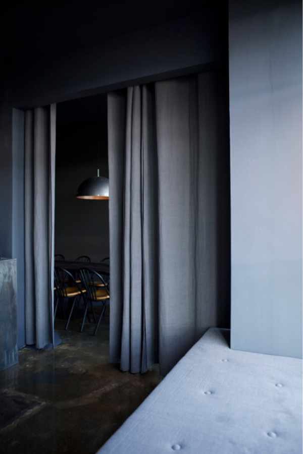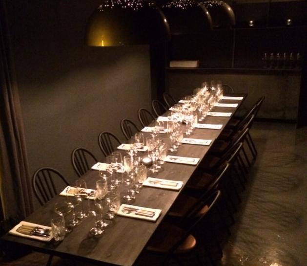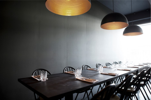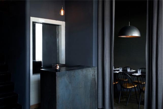 Colores negros, grises y blancos, reciben el punto de calidez mediante los asientos de haya dorada de las sillas windsor y el interior dorado de los plafones del techo. Un viejo ascensor de carga se ha restaurado y convertido en un estante de vinos.
