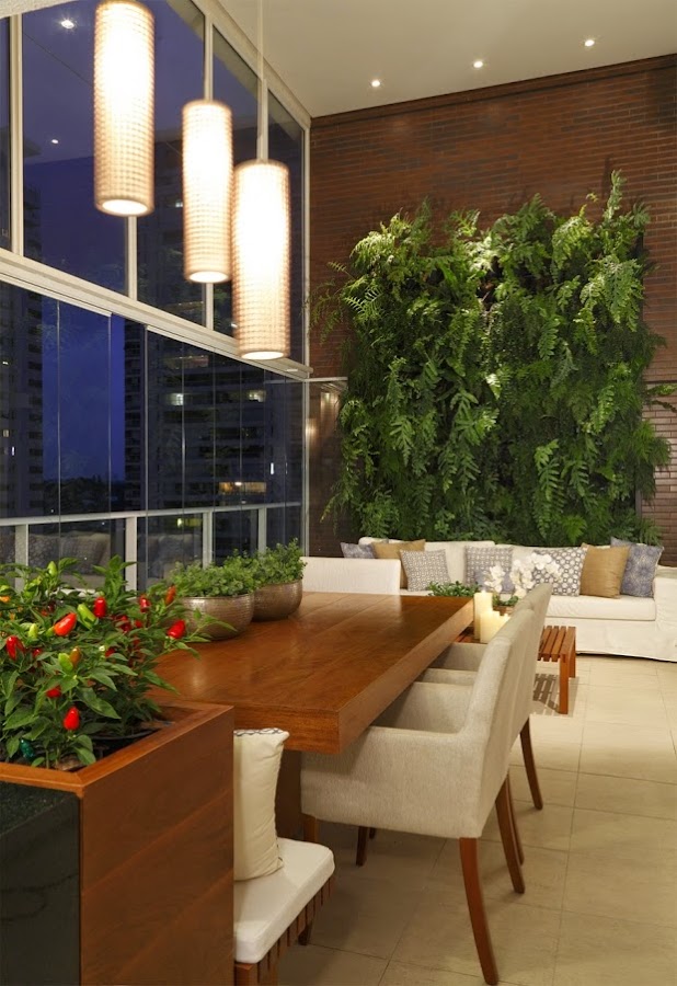 En la terraza fue diseñada con un gran cierre acristalado, con la idea de conseguir la sensación de estar al aire libre pero con la comodidad del interior sin faltar el oxigeno que aportan las plantas con ese panel de hojas verdes.