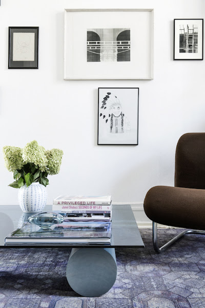 Esta otra sala parece un espacio reservado a los libros y al arte. Es donde se encuentra el contraste más fuerte entre lo moderno, como la mesa baja con patas de cuerpos geométricos, con lo vintage, como el sillón tapizado en lana. La naturaleza sigue estando presente.