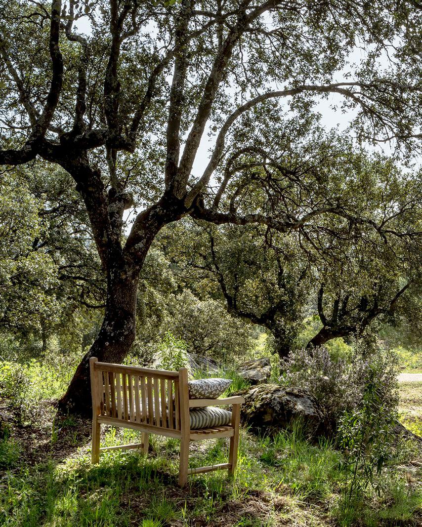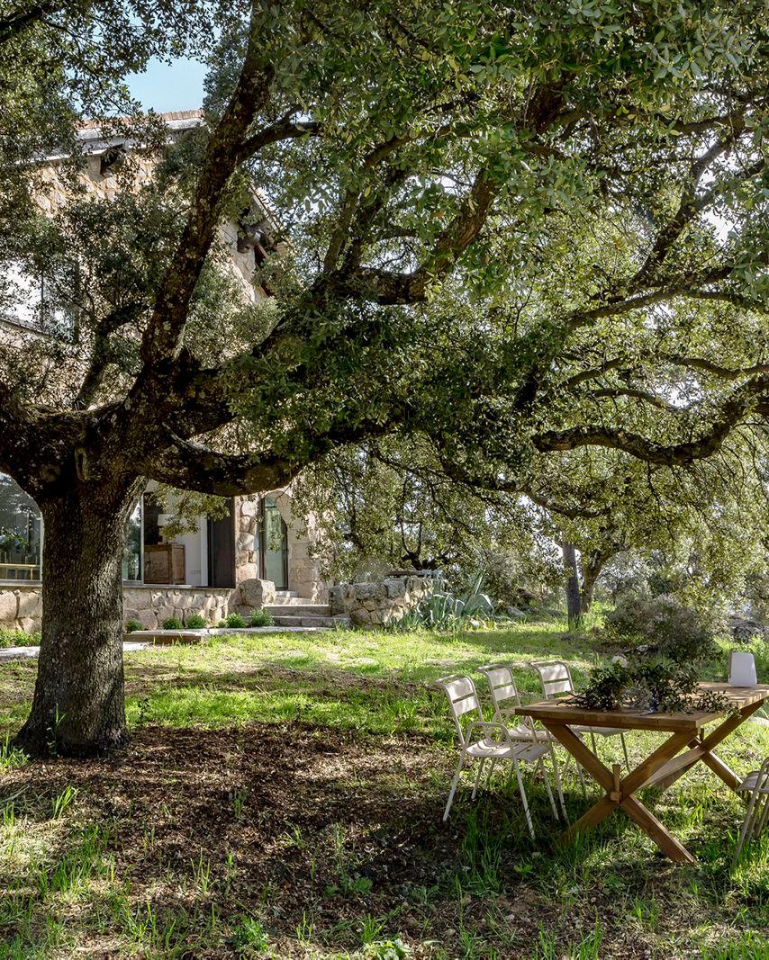 Se trata de una finca de 30 hectáreas privilegiadamente rodeada de encinas, que necesitó una intervención integral tanto a nivel de arquitectura, como de interiorismo e incluso paisajismo, un completo vaya. Pero cuyo resultado estáis a punto de ver y en mi opinión, no ha podido ser mejor.