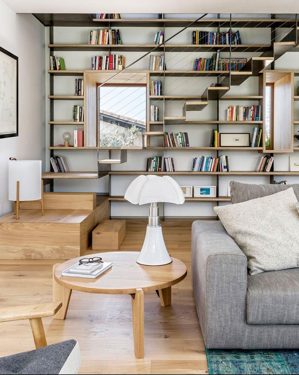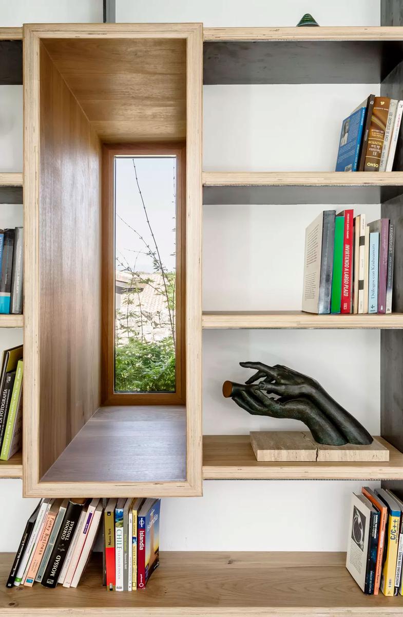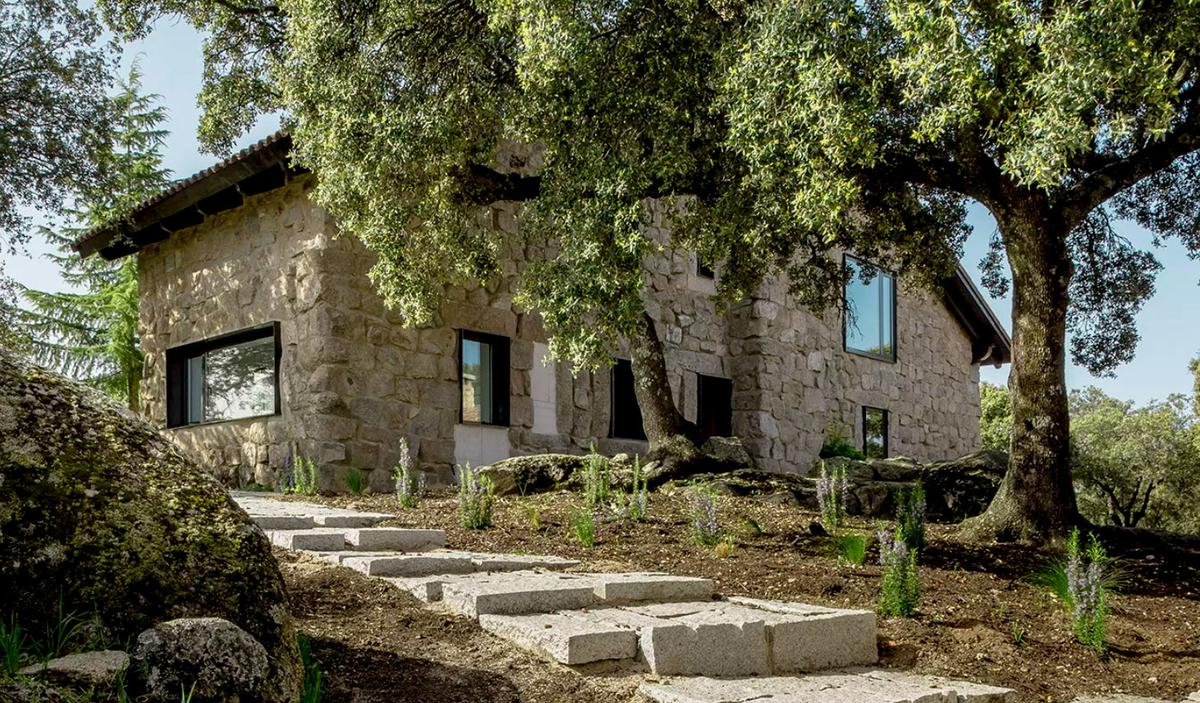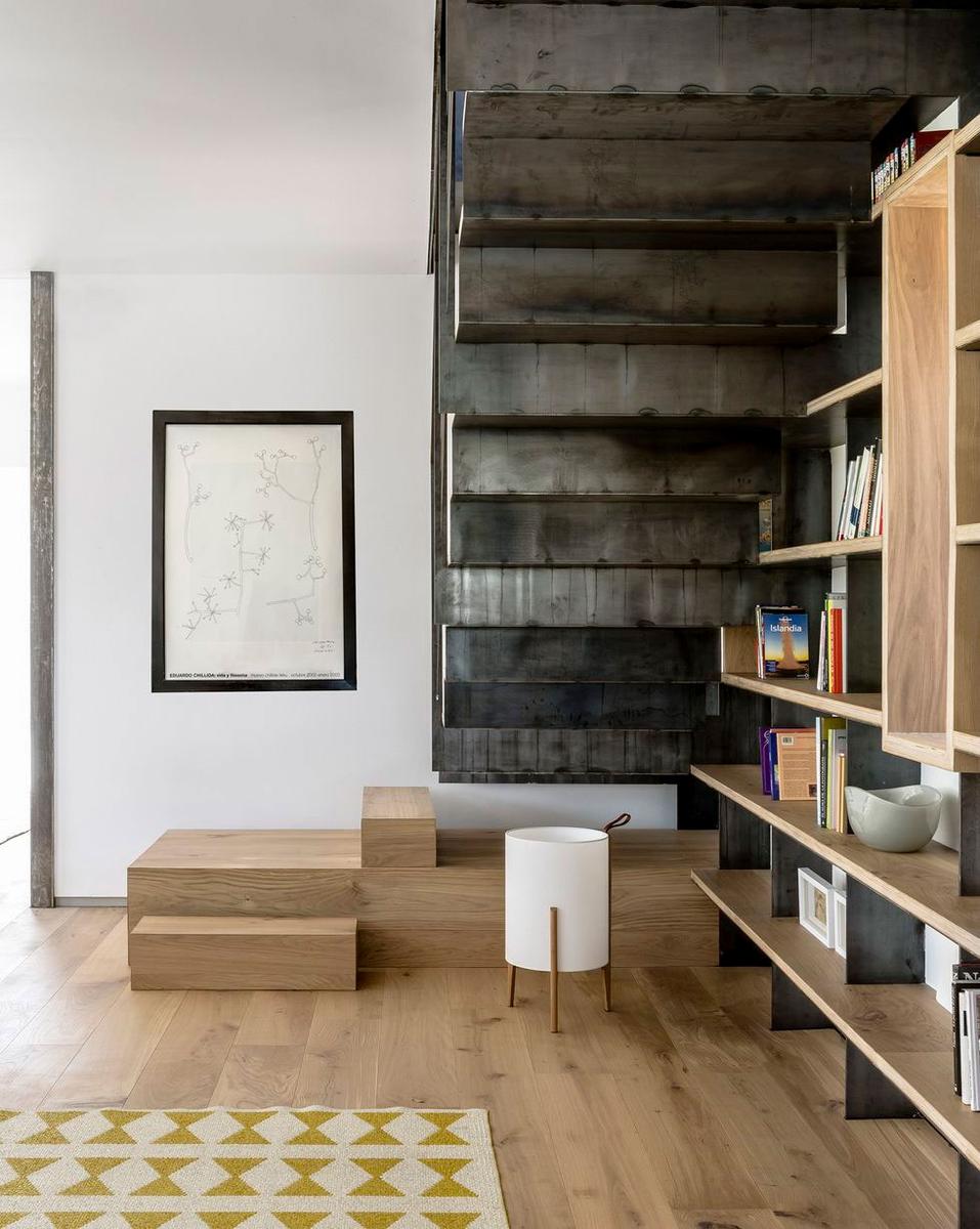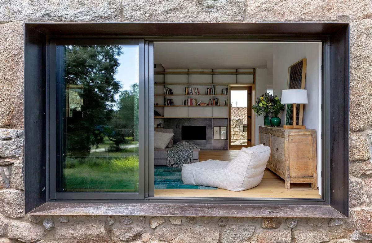 Los muros de la vivienda se recuperaron al completo, tienen un grosor de 70 cm por lo que los convierte en el mejor de los aislantes, tanto en invierno como en verano. Se abrieron dos accesos desde la planta baja, que se dejó diáfana (aunque se pusieron puertas correderas para independizar a demanda), lo que permite que la luz discurra por todo el espacio, así como que haya una comunicación visual entre el salón, el comedor y la cocina. Parte del mobiliario se integra en la casa de manera escultórica, como la escalera de chapa o la librería que recorre la pared del salón y que, en ocasiones, aprovecha esos 70 cm de pared para crear vanos a modo de pequeños miradores que permiten que el paisaje se cuele en el interior de la casa.
