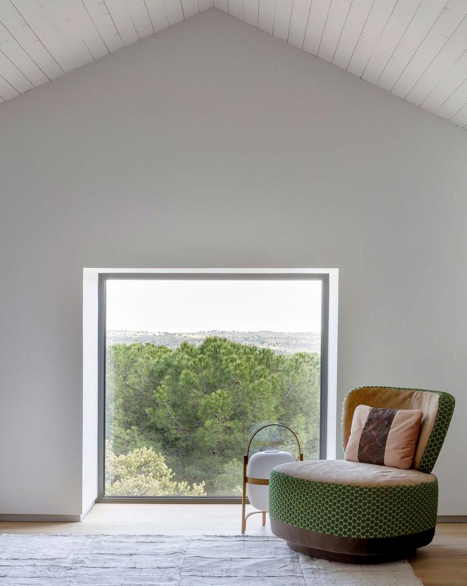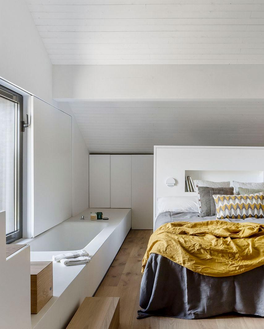 En la segunda planta, encontramos un dormitorio funcional con acceso a un despacho a través de unas escaleras. Nuevamente, se ha creado otra zona de estar junto a una ventana para contemplar las vistas. Incluso la bañera, que comparte espacio con el dormitorio, también se sitúa bajo una ventana. Parece como que en ningún momento, se quiera perder la esencia de esta vivienda, poder disfrutar de estar dentro de ella pero sin renunciar a la naturaleza que la rodea.