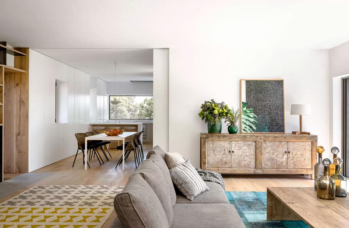 El mobiliario, también de Batavia, es todo de diseño. Como la lámpara que reposa junto a las escaleras de Gabriel Teixidó, el cuadro de Chillida, o el sofá de la firma italiana CRD Verzelloni. Junto a él, dos butacas gemelas de Hans J. Wegner, mesa auxiliar de Jean Prouvé y lámpara de Gae Aulenti. En la cocina, sillas de Jonas Forsman y la lámpara sobre la mesa, de Poul Henningsen.
