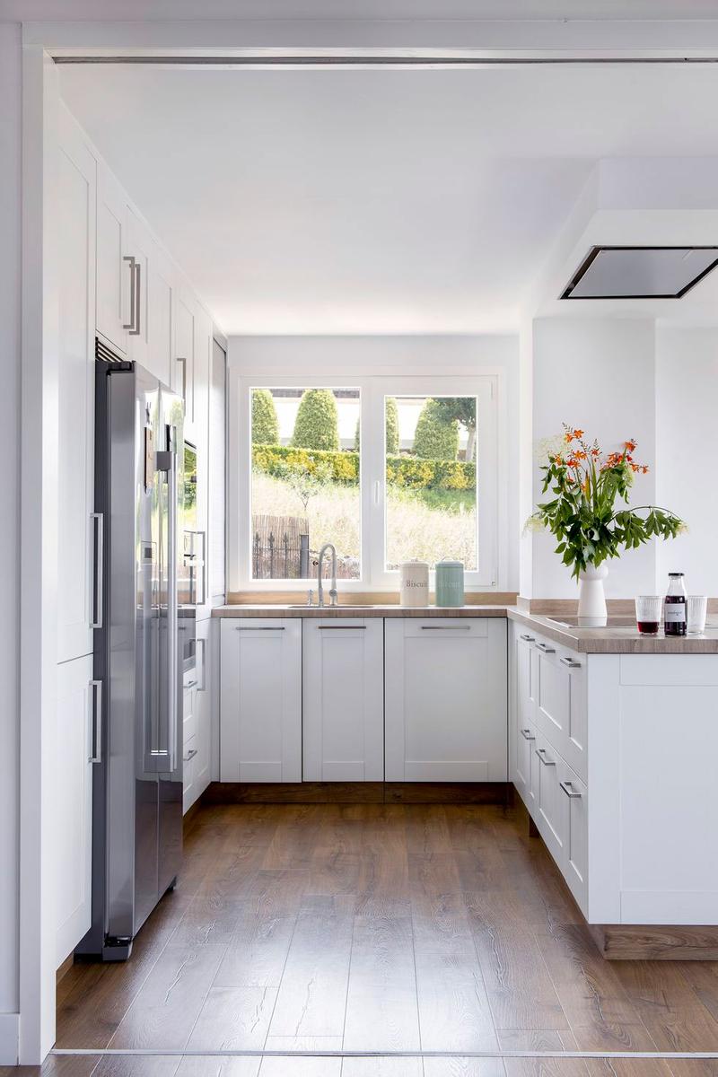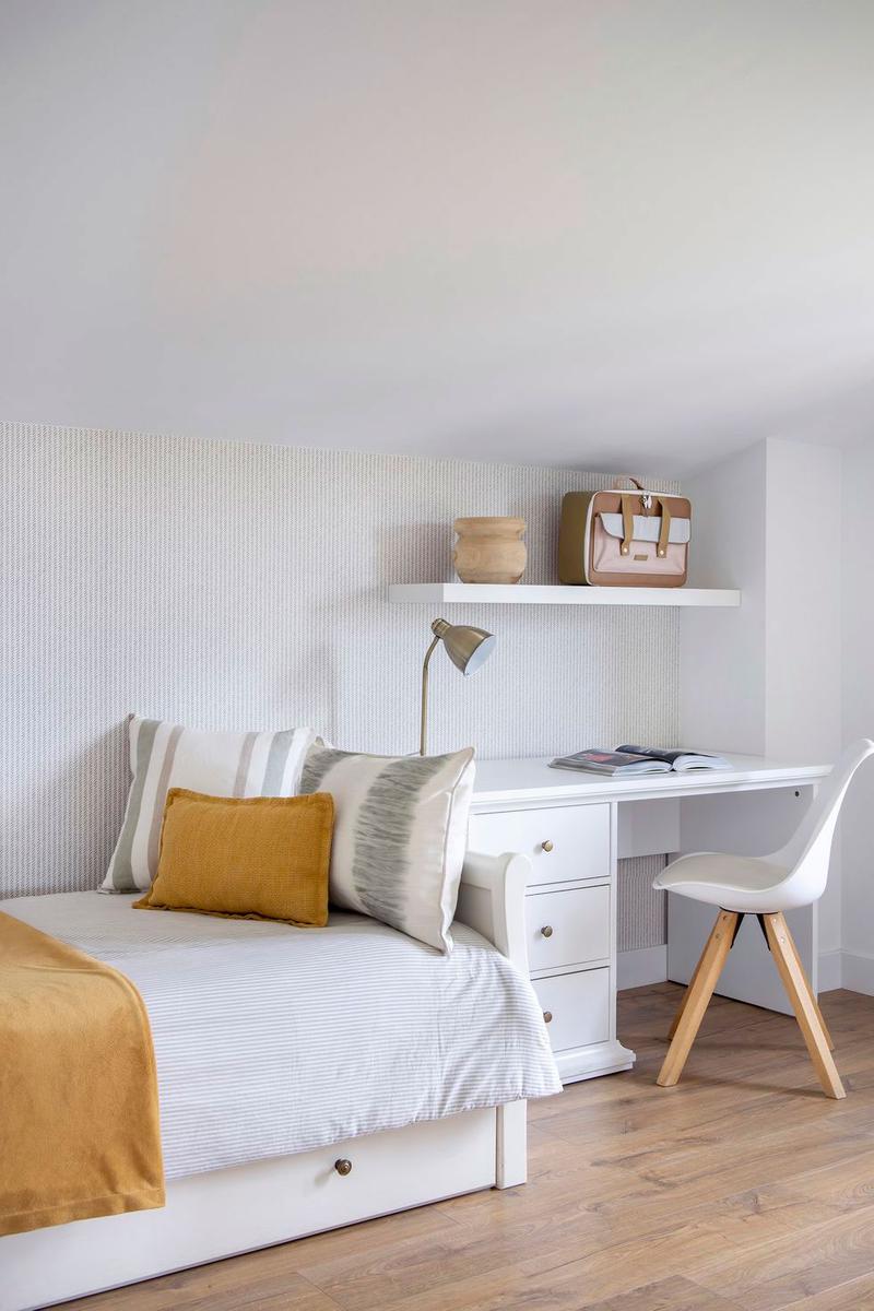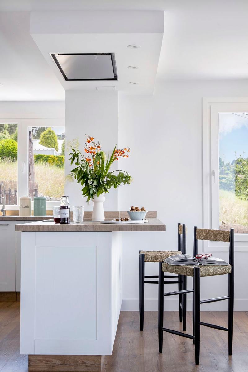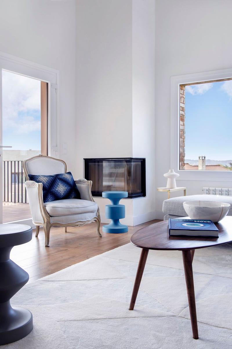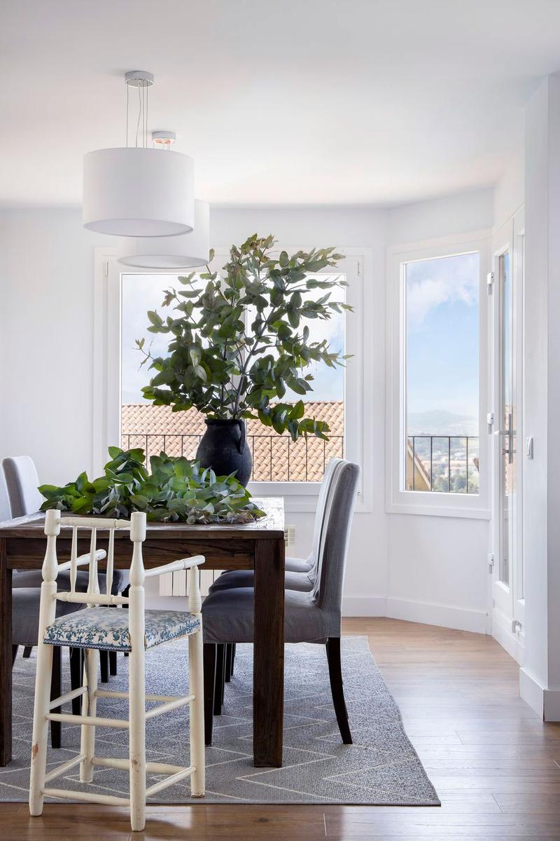 Carmen y su marido Chema, encargaron la reforma de esta vivienda unifamiliar de 240 metros cuadrados, a la interiorista Mar Vidal . La casa está dividida en tres plantas compuestas por salón, comedor, cocina, zona de lavado, cinco dormitorios, despacho, sala de juegos para los niños, terraza y jardín con piscina. Además de la intervención de la interiorista, Chema como arquitecto, estuvo muy presente en la toma de decisiones para ejecutar la obra, así, hubo elementos originales de la casa que decidieron conservar como las puertas, la de entrada y las correderas del salón que venían coronadas por unas bonitas molduras de escayola. También la doble altura presente en el salón, había un escalón que decidieron mantener, le daba presencia y es una manera de separar ambientes sin barreras visuales. Cambiaron la chimenea de sitio, enmarcándola entre los dos grandes ventanales desde donde se ve el bonito paisaje asturiano (casi que parecen cuadros).