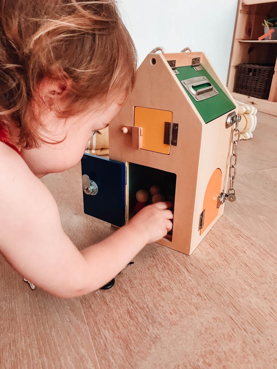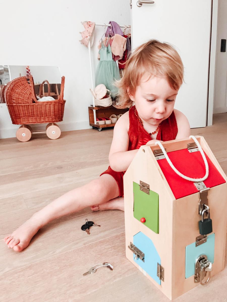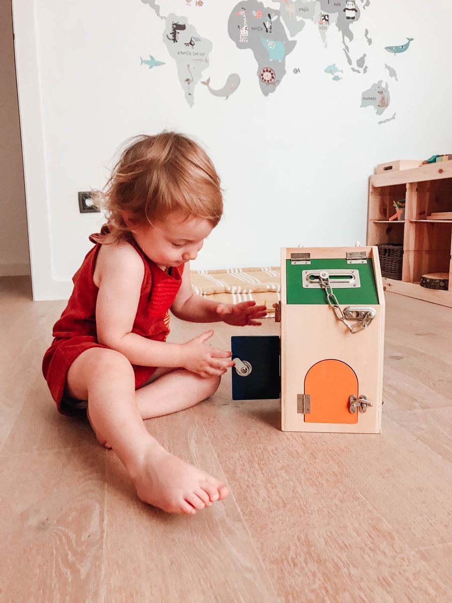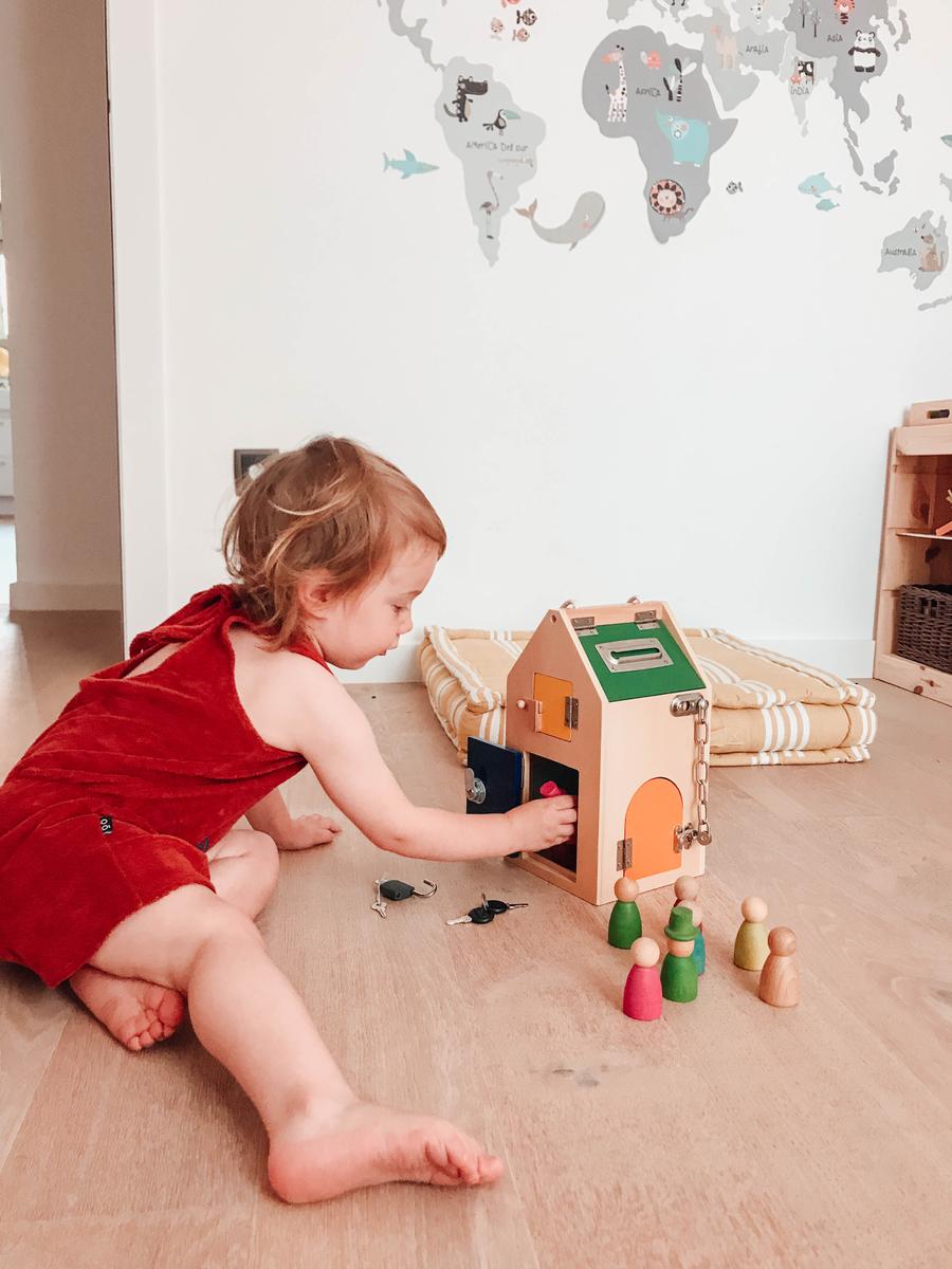El juguete no tiene más secreto que una casita con 8 aperturas. Cada una de las cerraduras representa un montón de retos en si misma. Descubrir cómo abrir, cómo cerrar, manipular el mecanismo, mirar dentro de la casa, meter y sacar objetos de ella,… Una casa inspirada en el concepto vida práctica de Maria Montessori que nos preparar para la vida real: abrir la casa con las llaves, el candado de la bici, el cerrojo del baño,… A vuestros pequeños exploradores ¡les fascinará!