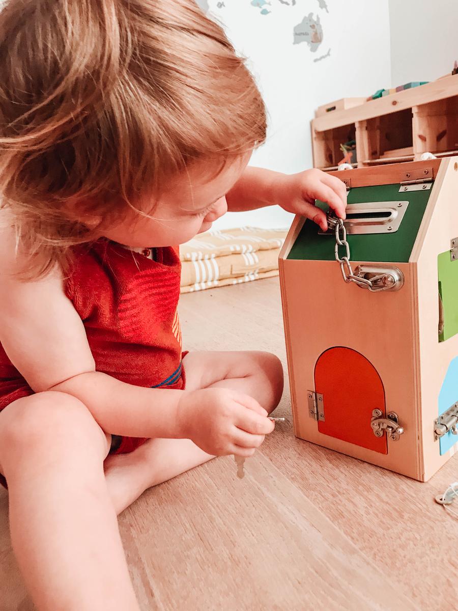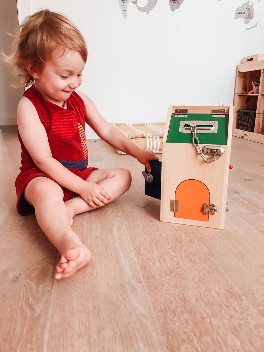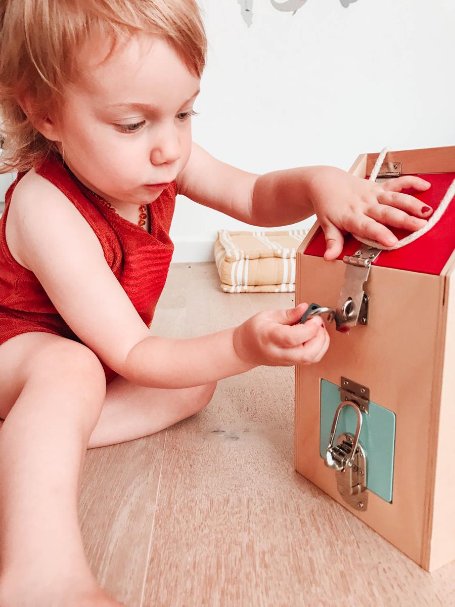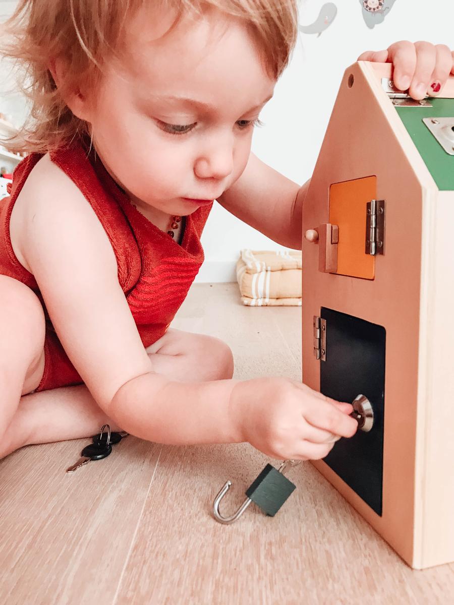El juguete no tiene más secreto que una casita con 8 aperturas. Cada una de las cerraduras representa un montón de retos en si misma. Descubrir cómo abrir, cómo cerrar, manipular el mecanismo, mirar dentro de la casa, meter y sacar objetos de ella,… Una casa inspirada en el concepto vida práctica de Maria Montessori que nos preparar para la vida real: abrir la casa con las llaves, el candado de la bici, el cerrojo del baño,… A vuestros pequeños exploradores ¡les fascinará!
