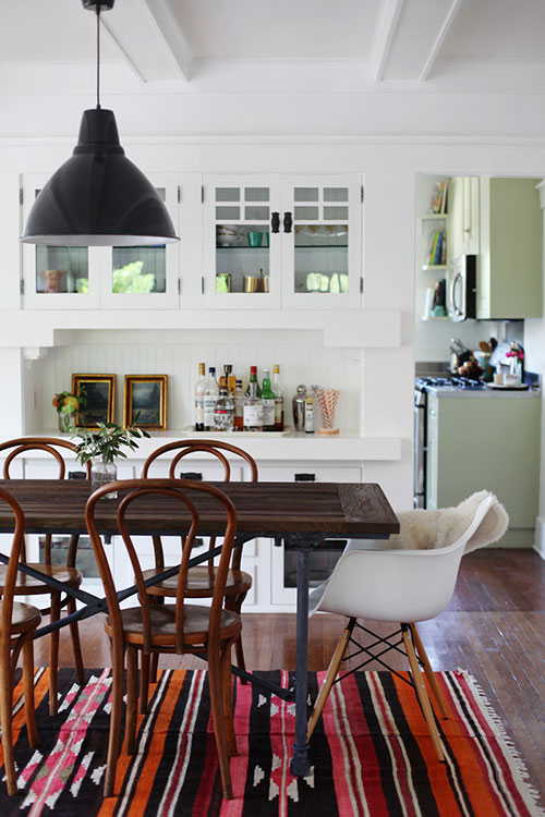 Sillas antiguas de Madera curvada del Auditorio Cívico Mayo que se remontan a los años 40, conseguidas en eBay. Una mesa del comedor de Restoration Hardware, una antigua alfombra kilim... Le dan a su vivienda ademas de personalidad el color necesario para contrastar entre los muchos tonos apagados y neutros.