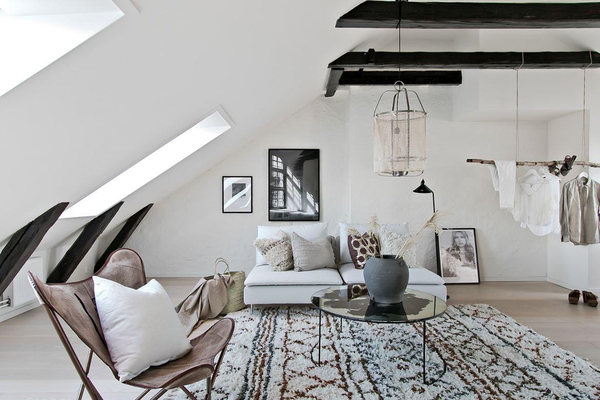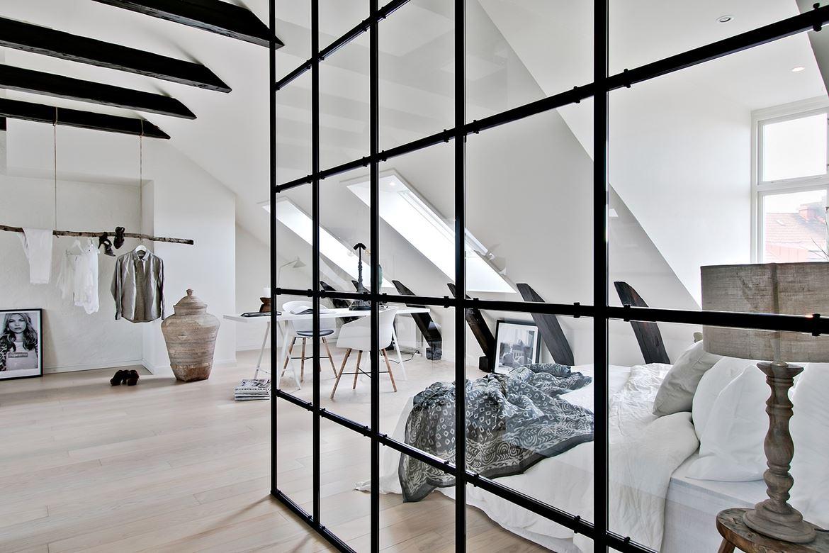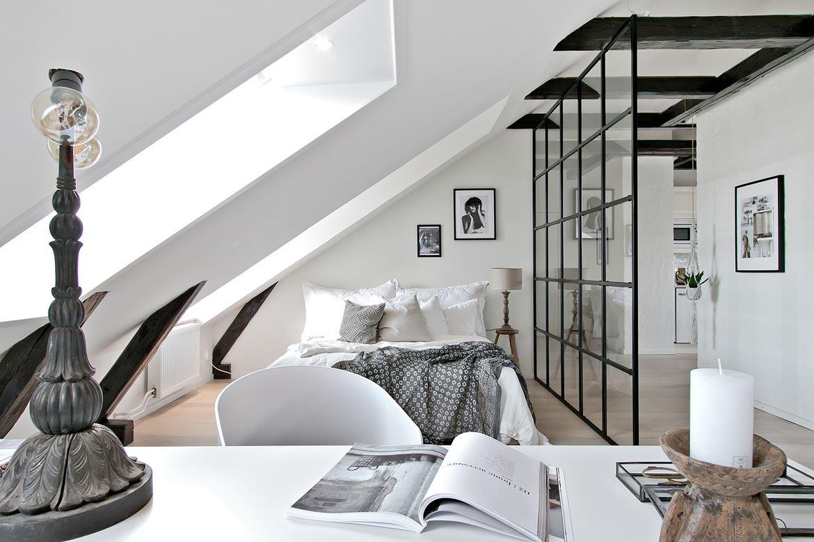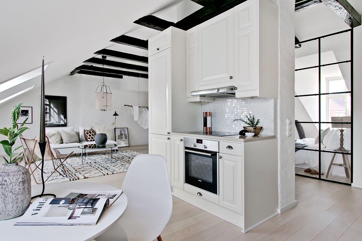 En 1910, el constructor David Olsson hizo este precioso edificio diseñado por el arquitecto Alfred Hellerström. La casa se ha mantenido muy bien y en 2012 toda la propiedad fue renovada, tanto en el exterior como en el interior. Incluso el patio interior se ha reformado con una iluminación y azulejos distintos que le dan mayor luz. Un solado de madera muy clara en combinación con la paredes blancas, acogen las vigas vistas pintadas en negro como el perfecto contraste. Un separador a modo de celosía en negro con vidrio transparente, hace las veces de tabique visual, pero comunicando los espacios. Muebles concretos y pensados para cada espacio, sin ser de gran formato. Los textiles aportan calidez. ¿No os parece un espacio mayor a pesar de los metros con los que cuenta?.