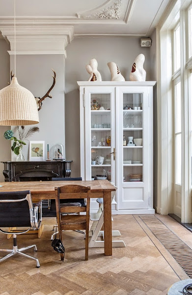 Si el pasado miércoles os enseñaba una casa de estilo ecléctico he de deciros que no tenía nada que ver con ésta. Comparten el estilo pero cada una de ellas tiene una magia especial que las hace únicas. Adoro los toques de color que salpican las estancias de esta vivienda, toques de color en su justa medida, ni fuertes ni suaves y que sobre una base blanca resultan luminosos y atractivos. Los techos altos con sus enormes molduras, los grandes ventanales, las chimeneas y las vigas hacen de esta casa una vivienda especial. En cuanto a la "deco" me gustan un montón de ideas, pero reconozco que lo que ha conquistado mi corazón son los dormitorios infantiles. El papel de flores es impresionante, el armarito pintado de blanco espectacular (me hace recordar a alguno que ha salido de mis manos, aquí y aquí), el columpio en medio del dormitorio......Creo que solo hay una cosa que cambiaría en esta preciosa casa y es la moqueta de la escalera. El caso es que el color me gusta pero el material......¿qué me decís? Y ahora, sin más, os dejo que disfrutéis de los detalles, de la personalidad y el carácter que habitan en todos los rincones.