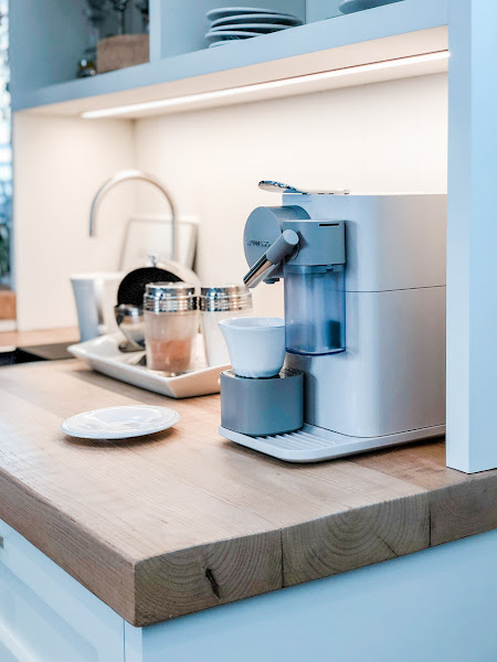 Y cuenta con su propia estación de café para quienes somos amantes de la