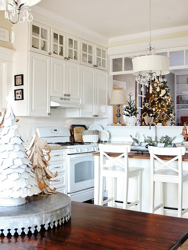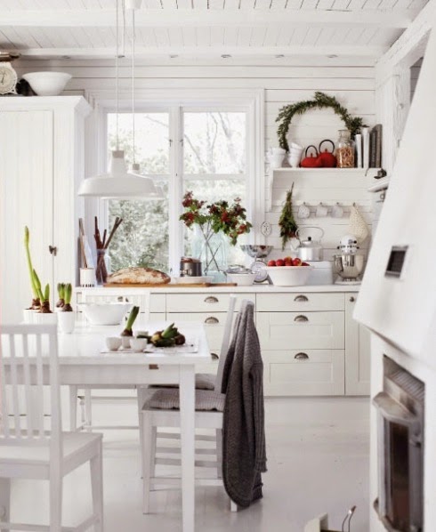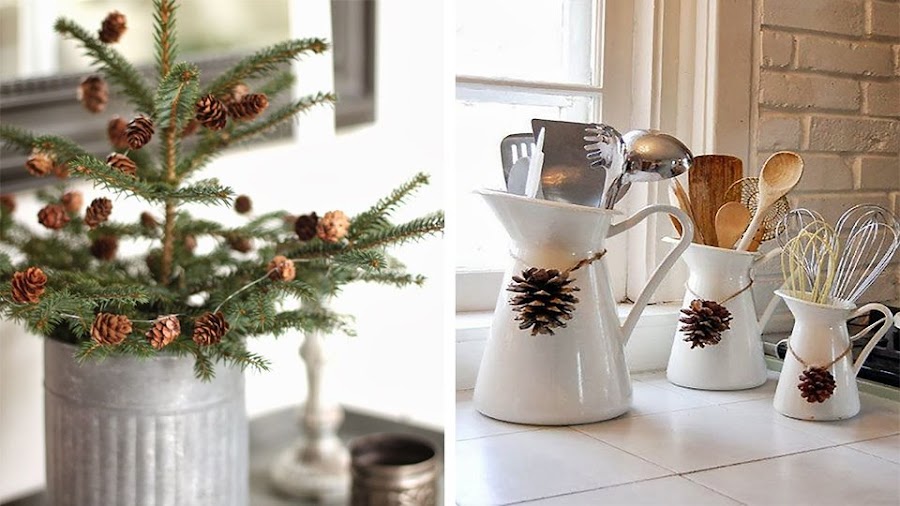 * No es necesario colocar un árbol de navidad en medio de la cocina, puedes elegir algunos detalles como botes con motivos navideños, adornos para colgar en los armarios, etc. Puedes colocar ramas de abeto fresco en un jarrón o directamente sobre la encimera con algún detalle en rojo, blanco o dorado.
