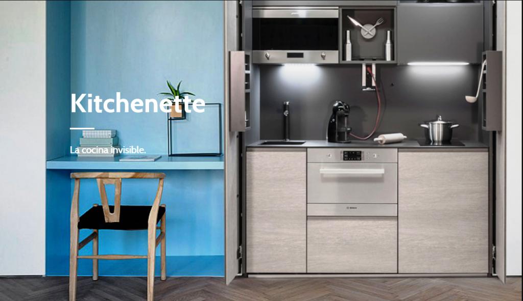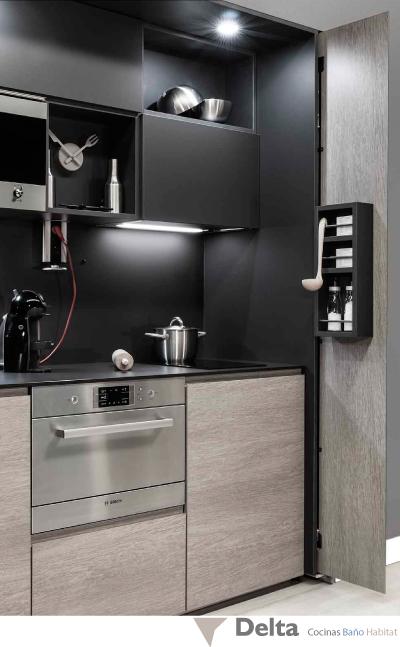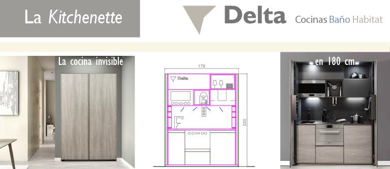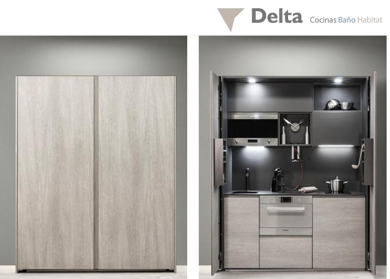 Cuando el espacio apremia y en el diseño de un apartamento están integrados diferentes espacios, como la zona de estar, comedor y cocina, es compatible la funcionalidad con la estética, y en Delta Cocinas cuentan con cocinas para apartamentos, gracias a la nueva línea Kitchenette, integrada en el ambiente y en la decoración, consiguiendo una cocina invisible. Oculta tras unas puertas escamoteables pero aprovechada al milímetro con todos los imprescindibles de una cocina: zona de aguas, cocción y almacenamiento, sin faltar un pequeño frigorífico, es la solución.
