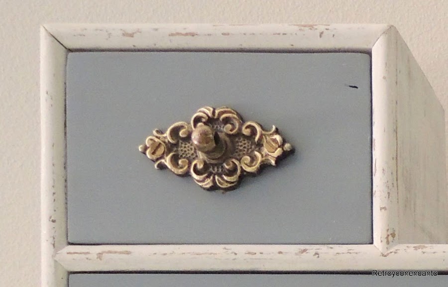 Lo primero que hicimos fue darle un buen "fregoteo", que falta le hacía, y tapar un par de agujeritos que la polilla juguetona había hecho en uno solo de los cajones. Después, le tocó a los pequeños pomos..., que tienen su historia. Ya empezamos mal con ellos porque, en el momento de la adquisición del auxiliar, se nos cayó el primer cajoncito al suelo, con tan mala suerte que el "mini-tirador" murió (r.i.p.). Pero eran tan monos y tenían tanta mugre... Una noche sumergidos en amoniaco hicieron el milagro. Ya buscaríamos solución para sustituir al fallecido.