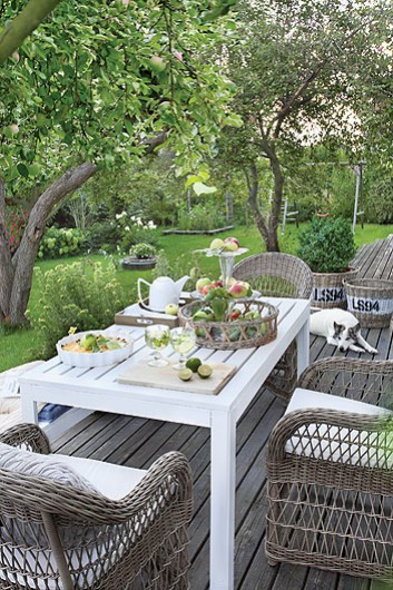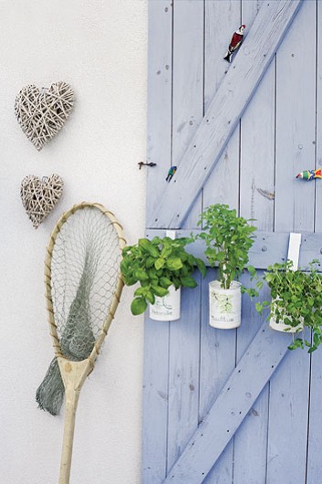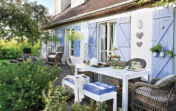 Y si os ha gustado el interior no os perdáis el maravilloso exterior que posee la vivienda, preciosas las contraventanas de madera en azul lavanda y la zona de estar que han creado en el porche.