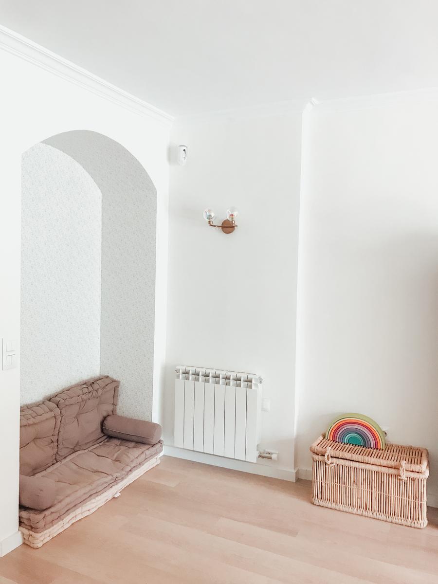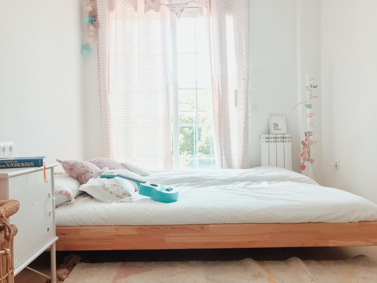 Sus hijas duermen en la habtiación de al lado, bien bien juntas, se han creado un tatami para dormir bien ancha con dos camas de Ikea de estilo Montessori preciosas. Las dimensiones de la habitación son suficientes como para ir cambiando la distribución a medida que las niñas vayan creciendo.